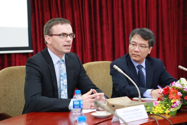 Bộ trưởng Ngoại giao Estonia Sven Mikser(trái) và Giám đốc Học viện Ngoại giao Nguyễn Vũ Tùng tại buổi giao lưu.