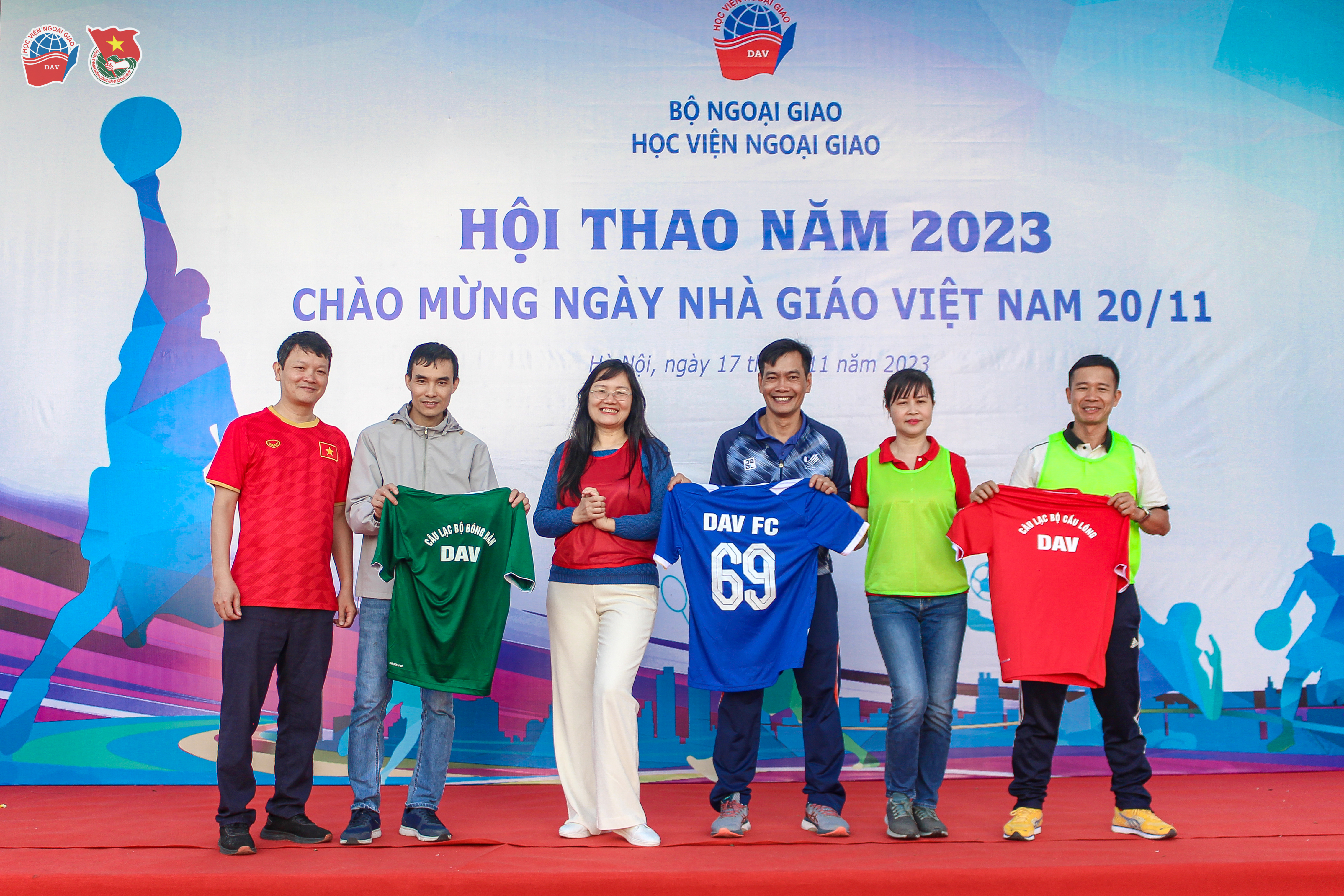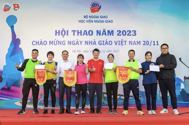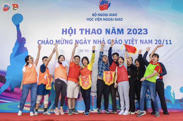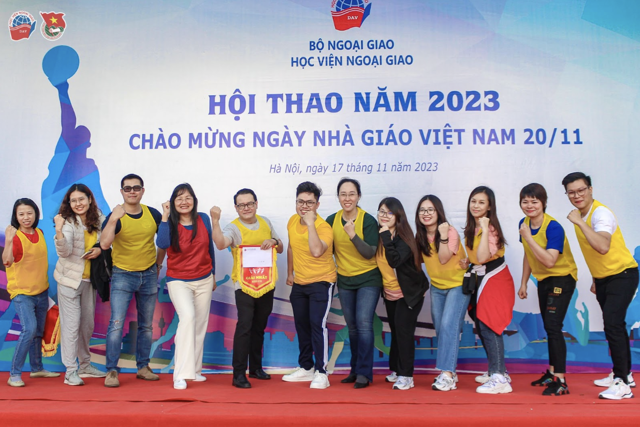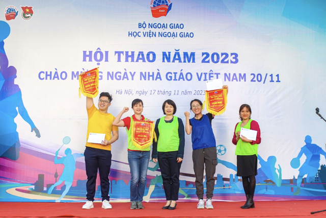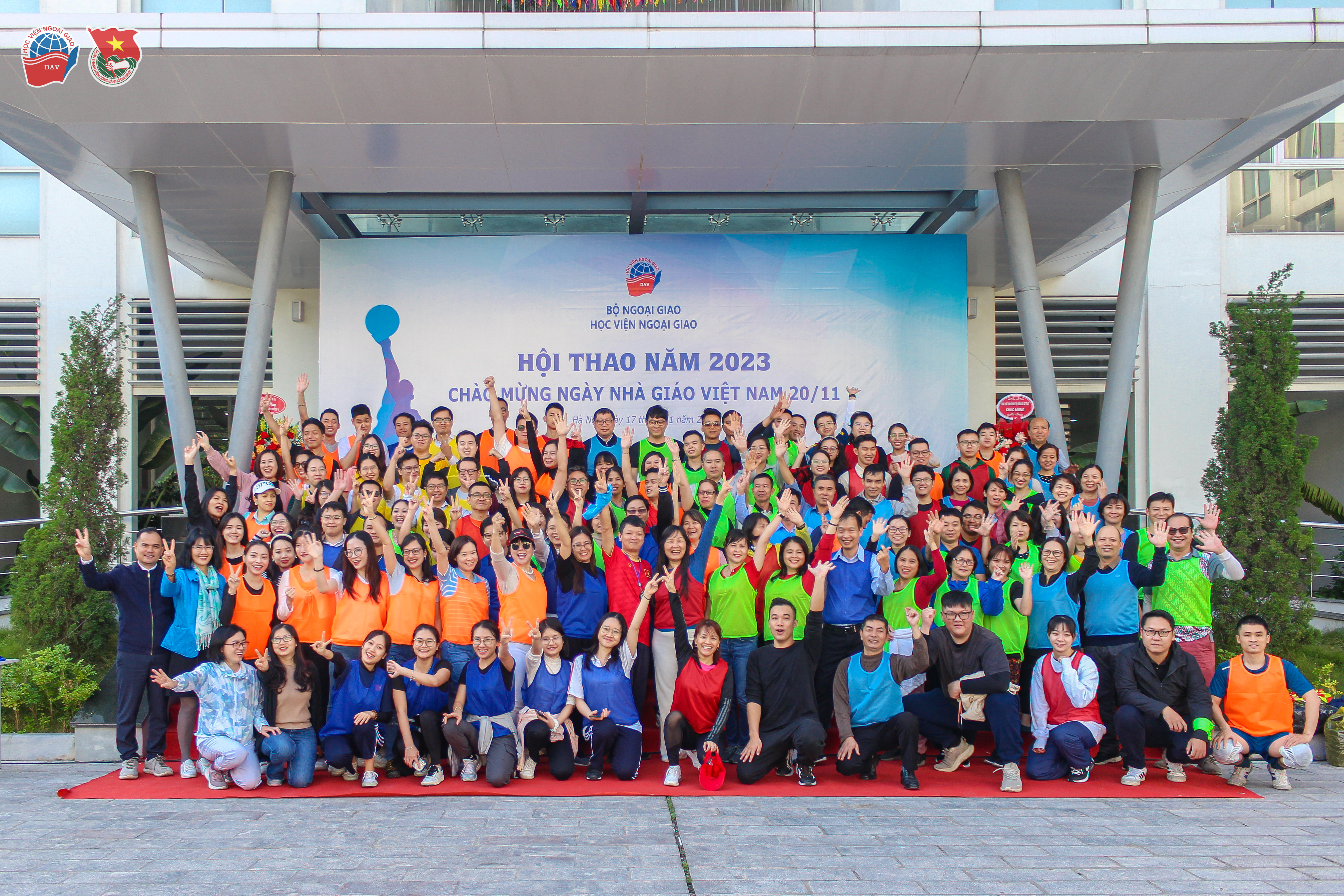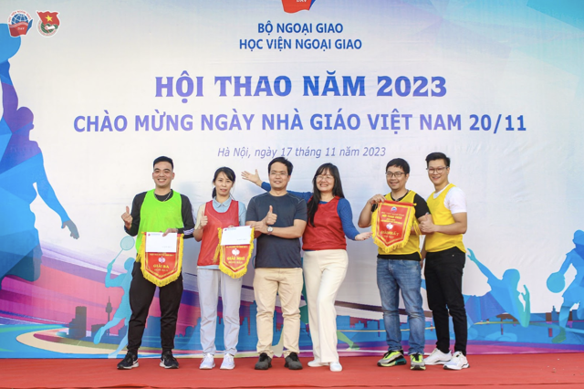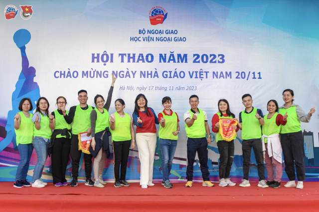 Tham gia “Hội thao 2023 chào mừng ngày Nhà giáo Việt Nam 20/11” có sự hiện diện của Cô Phạm Lan Dung - Quyền Giám đốc Học viện Ngoại giao; Cô Nguyễn Thị Thìn - Trưởng Ban Đào tạo Học viện; Cô Đỗ Tư Hiền - Chủ tịch Công đoàn Học viện cùng sự góp mặt của Lãnh đạo các đơn vị và toàn thể cán bộ, giảng viên đang công tác tại Học viện.