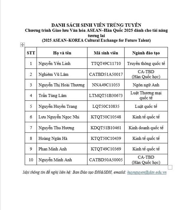 Ban Tổ chức chúc mừng 10 sinh viên xuất sắc dưới đây đã trúng tuyển “Chương trình Giao lưu Văn hóa ASEAN–Hàn Quốc 2025 dành cho tài năng tương lai” (2025 ASEAN–KOREA Cultural Exchange for Future Talent)