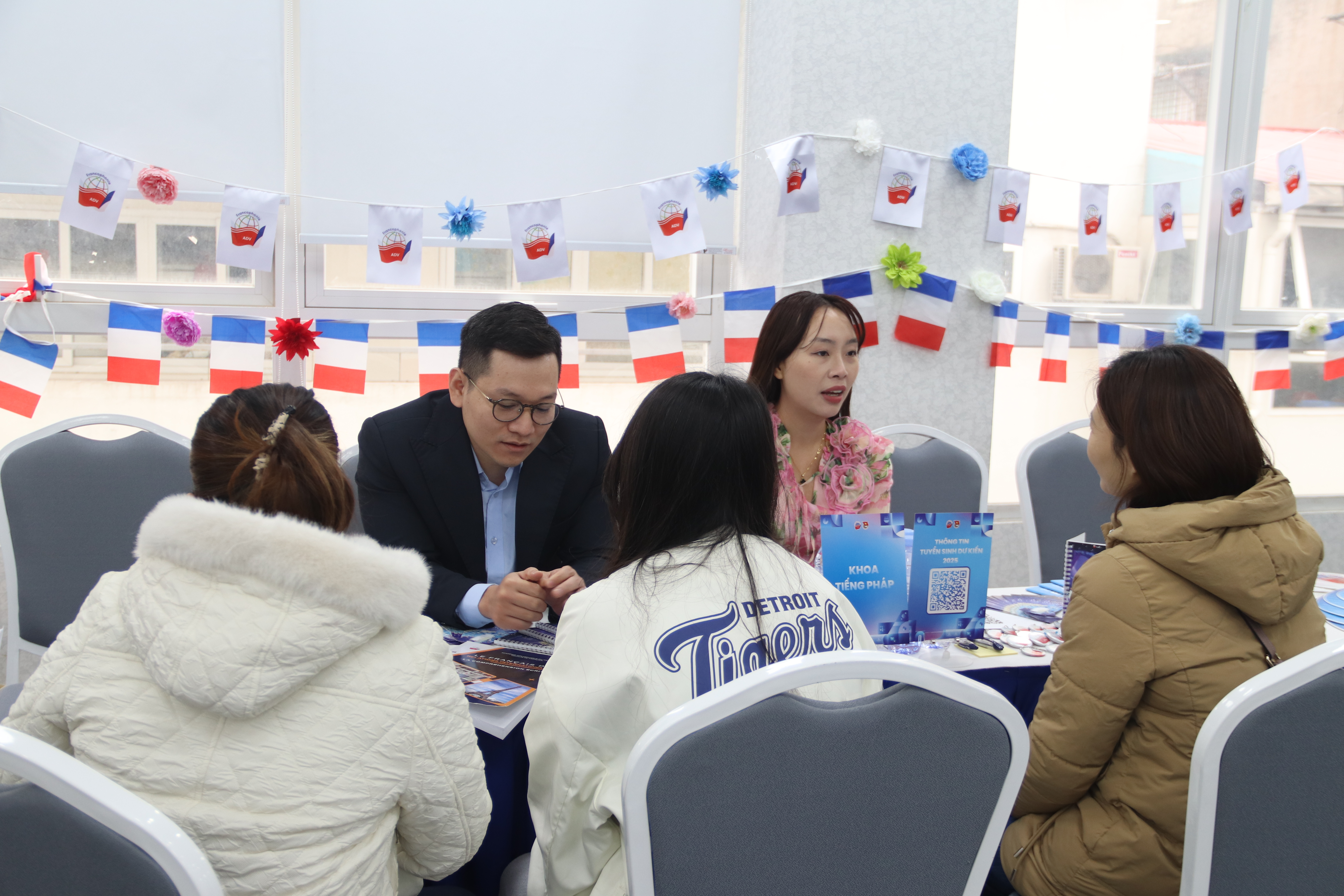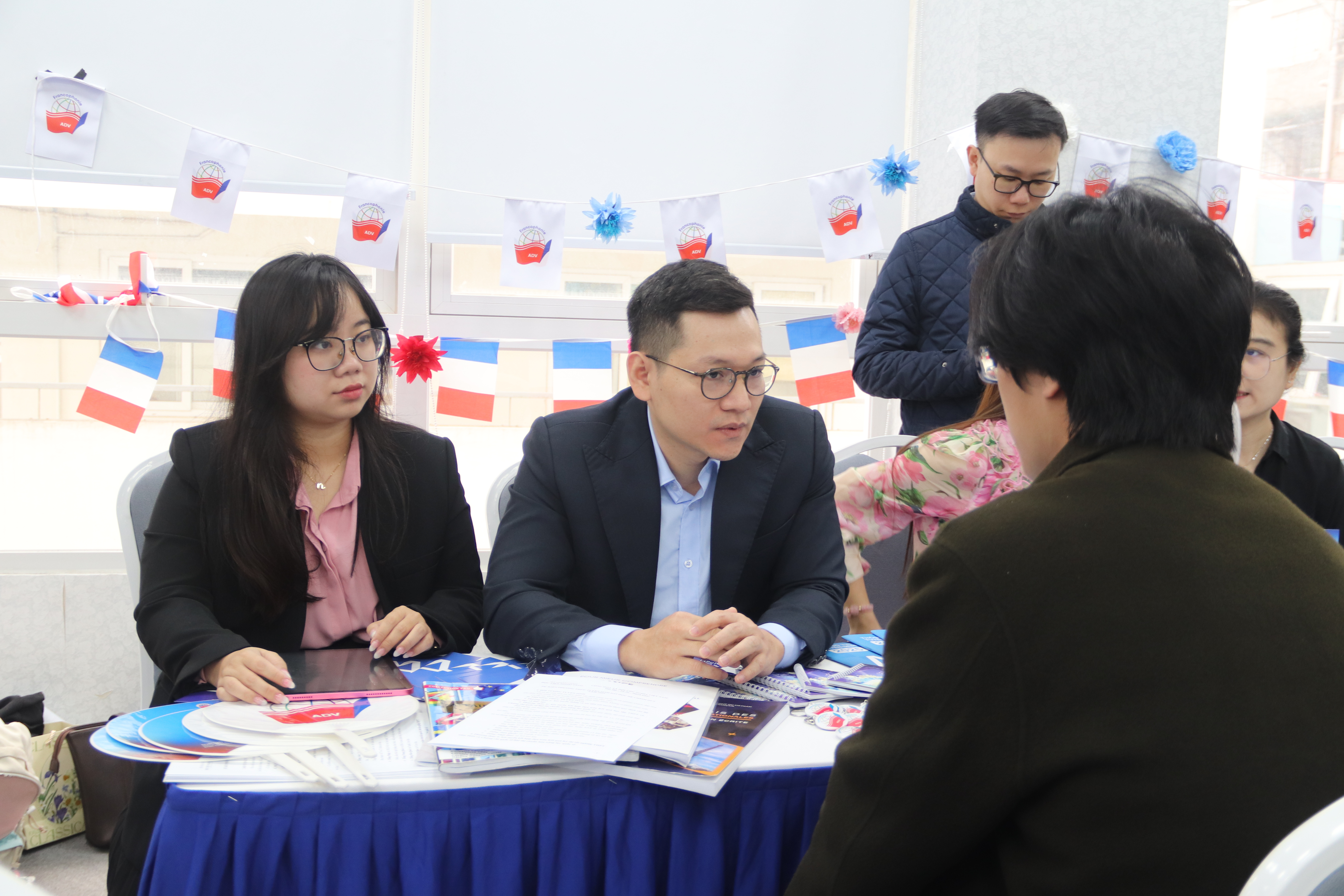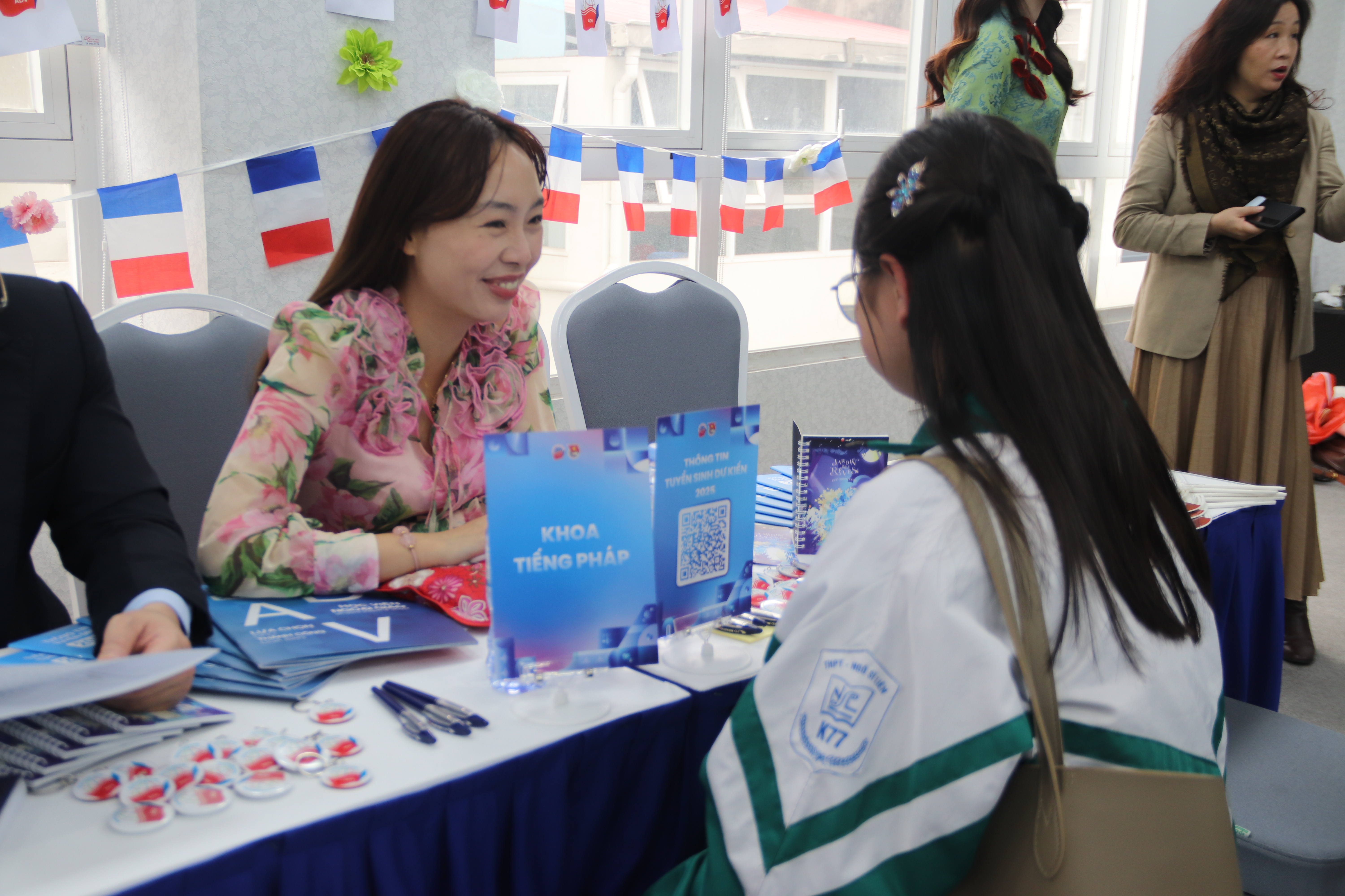 DAV Open House 2025 là cầu nối giúp học sinh và phụ huynh giải đáp mọi thắc mắc liên quan đến quy trình tuyển sinh, chương trình đào tạo và cơ hội nghề nghiệp trong tương lai. Tại khu vực tư vấn, đội ngũ giảng viên cùng các sinh viên khoa Pháp đã tận tình chia sẻ những thông tin quan trọng về phương thức xét tuyển, định hướng chuyên môn và những lợi thế khi theo học tại DAV cũng như giải đáp tận tình về quy trình tuyển sinh, chương trình đào tạo và cơ hội nghề nghiệp khi theo học tại DAV. Nhờ đó, các bạn trẻ có thể tự tin lựa chọn con đường theo đuổi ngoại giao, giảng dạy và phát triển trong các lĩnh vực như truyền thông quốc tế, quan hệ quốc tế hoặc hợp tác song phương giữa Việt Nam và các quốc gia nói tiếng Pháp.