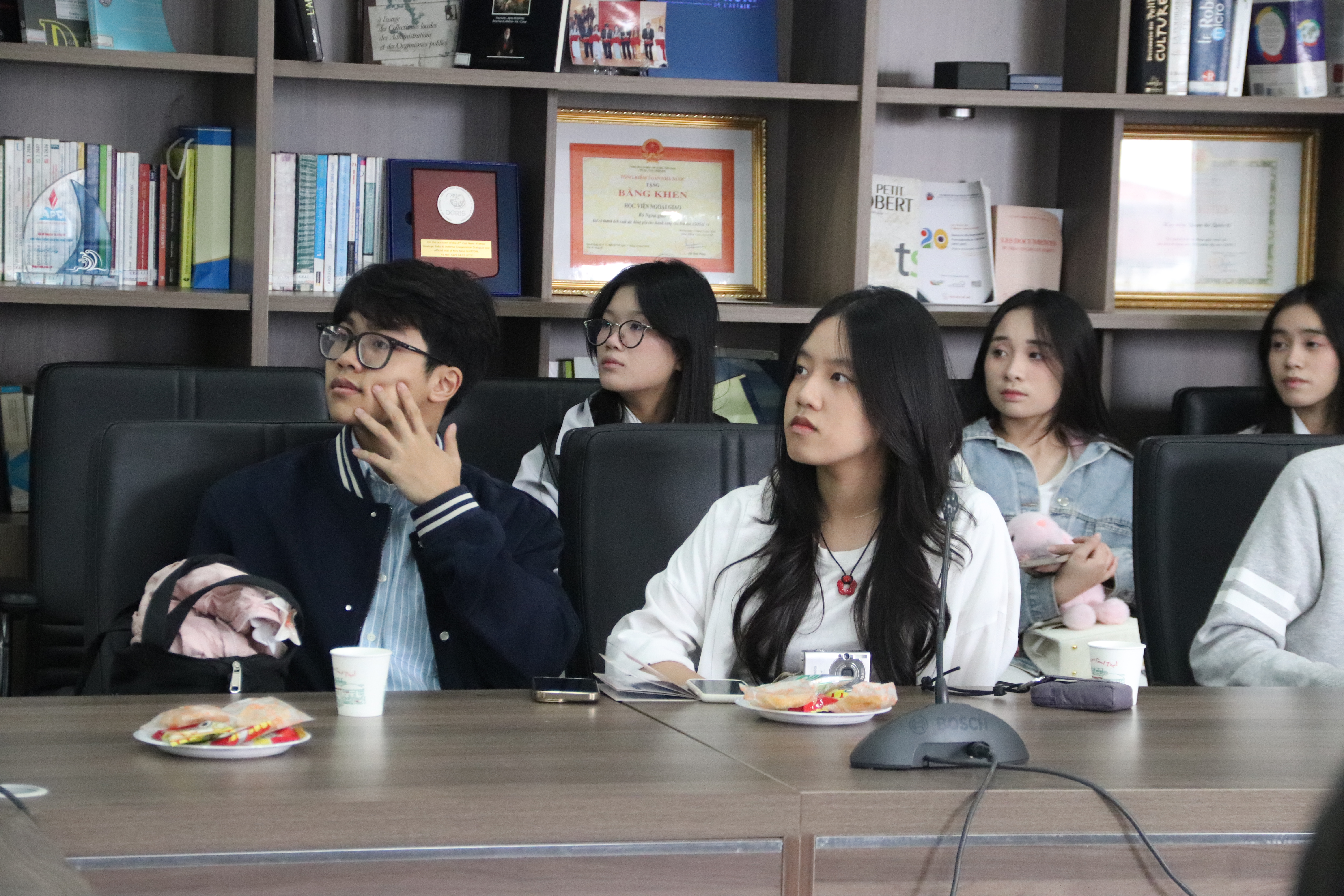 Trong khuôn khổ sự kiện, các bạn học sinh tham quan được trải nghiệm tour khám phá Học viện, được hòa mình vào không gian học tập hiện đại với các tiện ích hàng đầu. Từ thư viện Pháp ngữ rộng lớn với kho tài liệu phong phú, phòng học và phòng họp tiện nghi, mỗi không gian đều thể hiện rõ nét tinh thần “Hội nhập - Phát triển” của Học viện Ngoại giao. Những tiện ích này không chỉ đáp ứng nhu cầu học tập và nghiên cứu mà còn khuyến khích sự sáng tạo, phát triển tư duy và kết nối cộng đồng học thuật, giúp các bạn học sinh hình dung rõ nét về cuộc sống sinh viên năng động.