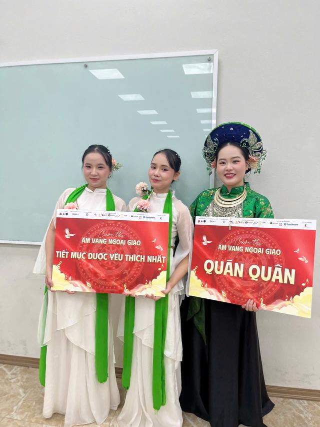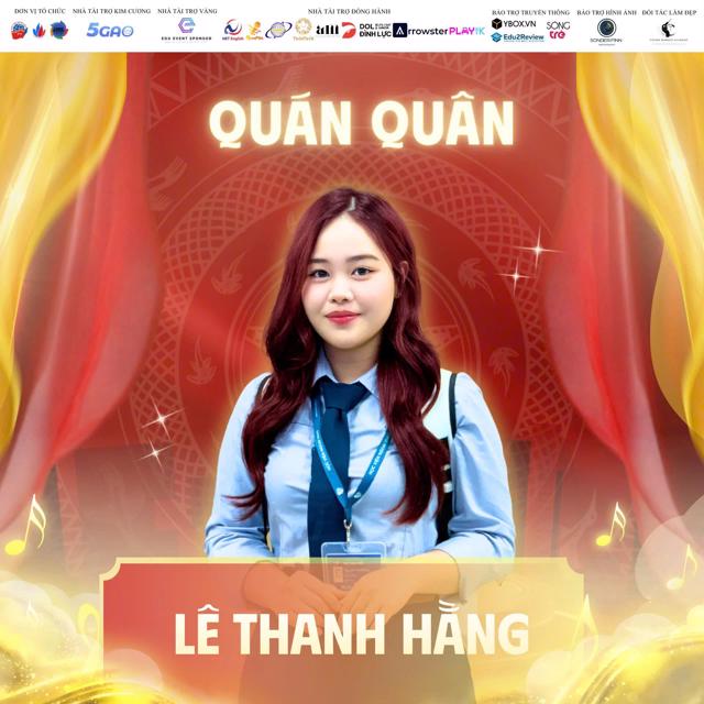 Bạn Lê Thanh Hằng, lớp NNA-K49 đã xuất sắc giành Giải Quán quân với tiết mục Mashup Phong nữ – Tứ phủ – Cô đôi thượng ngàn. Phần trình diễn được đánh giá cao nhờ sự kết hợp hài hòa giữa âm nhạc truyền thống và phong cách thể hiện hiện đại, thể hiện chiều sâu văn hóa cùng bản lĩnh sân khấu ấn tượng. Hằng cũng là gương mặt quen thuộc tại nhiều sân chơi văn nghệ của Học viện Ngoại giao, từng đạt Giải Nhì Hán ngữ Idol, Giải A cuộc thi hát ru – hát dân ca Quân khu 2, Top 6 E-talent Khoa Tiếng Anh, đồng thời là thành viên tích cực của CLB Âm nhạc Học viện, có nhiều đóng góp quan trọng cho các hoạt động văn nghệ phong trào của Bộ Ngoại giao.