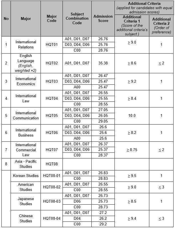 1. For the majors: International Relations, International Economics, International Law, International Business, International Communication, Asia–Pacific Studies, and International Commercial Law: Admission scores are calculated on a 30-point scale, consisting of the total of three subject scores plus priority points granted in accordance with the Ministry of Education and Training’s regulations (if any). Scores are rounded to two decimal places.