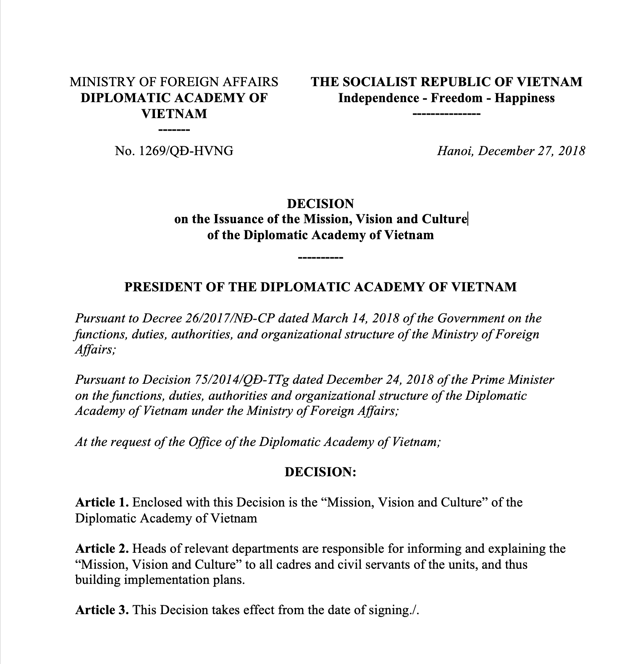 About usNews Decision on the Issuance of the Mission, Vision and Culture of the Diplomatic Academy of Vietnam 11:00 28/12/2018 Tweet