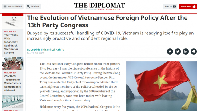 Dr. Le Dinh Tinh, Director General of the Institute for Foreign Policy and Strategic Studies, Diplomatic Academy of Vietnam, and researcher Lai Anh Tu published an article on The Diplomat about some developments in Vietnam's foreign policy after the 13th National Congress of the Party.