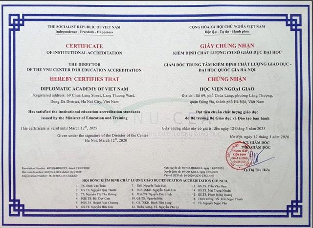 Receiving the certificate of institutional accreditation according to the set of standard criteria specified in Circular 12/2017/ TT-BGDĐT is the assessment and recognition for the Diplomatic Academy of Vietnam in all fields from executive management, research, teaching, cultivating, learning, finance and facilities. This is also a great challenge, yet a great motivation for the Academy to develop a very specific quality improvement plan in order to bring into play the strengths and to overcome the existing shortcomings and proceed to test the training programs following the standards of the ASEAN Universities Network (AUN).