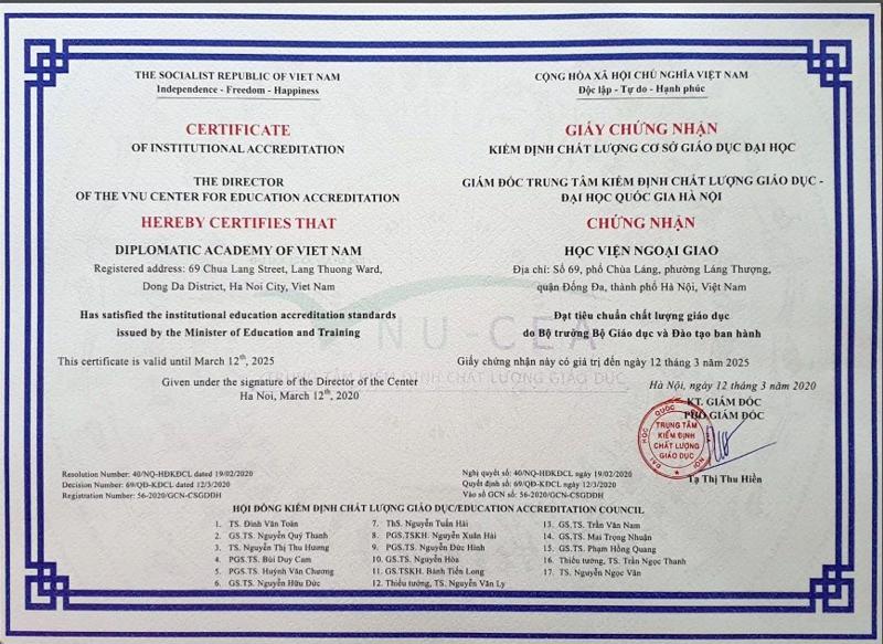 The accreditation of educational institutions according to Circular 12/2017 has been implemented by the Diplomatic Academy of Vietnam since June 2018, undergoing a self-assessment process, preliminary and official surveys of external evaluation of the education quality that took place from January 3rd-8th, 2020, at the Diplomatic Academy of Vietnam.