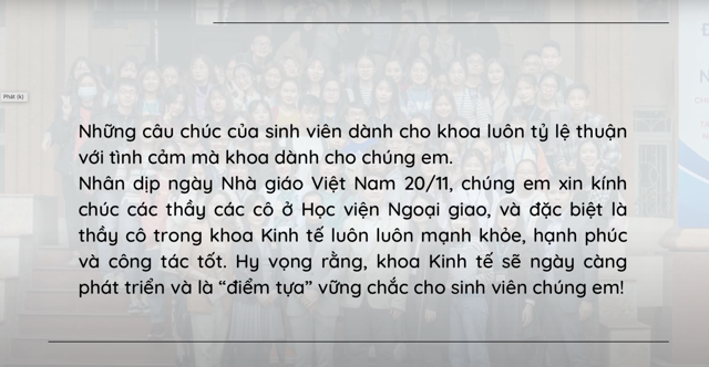 Through the enthusiastic response from students as well as alumni of the Faculty of International Economics, the competition "FOIE TOURNAMENT 2021 - Faculty of International Economics in me" has successfully brought positive meanings, contributing to increasing cohesion among the faculty and students of the Faculty. The entries filled with sincere feelings from the students are precious spiritual gifts of gratitude to teachers on the occasion of the Vietnamese Teachers' Charter Day, November 20. Hopefully in the near future, not only the "FOIE Tournament" but also many other quality competitions will be successfully launched and organized by the Faculty of International Economics - Diplomatic Academy of Vietnam to bring students useful playground and wonderful experiences during 4 years of youth at the Diplomatic Academy of Vietnam.
