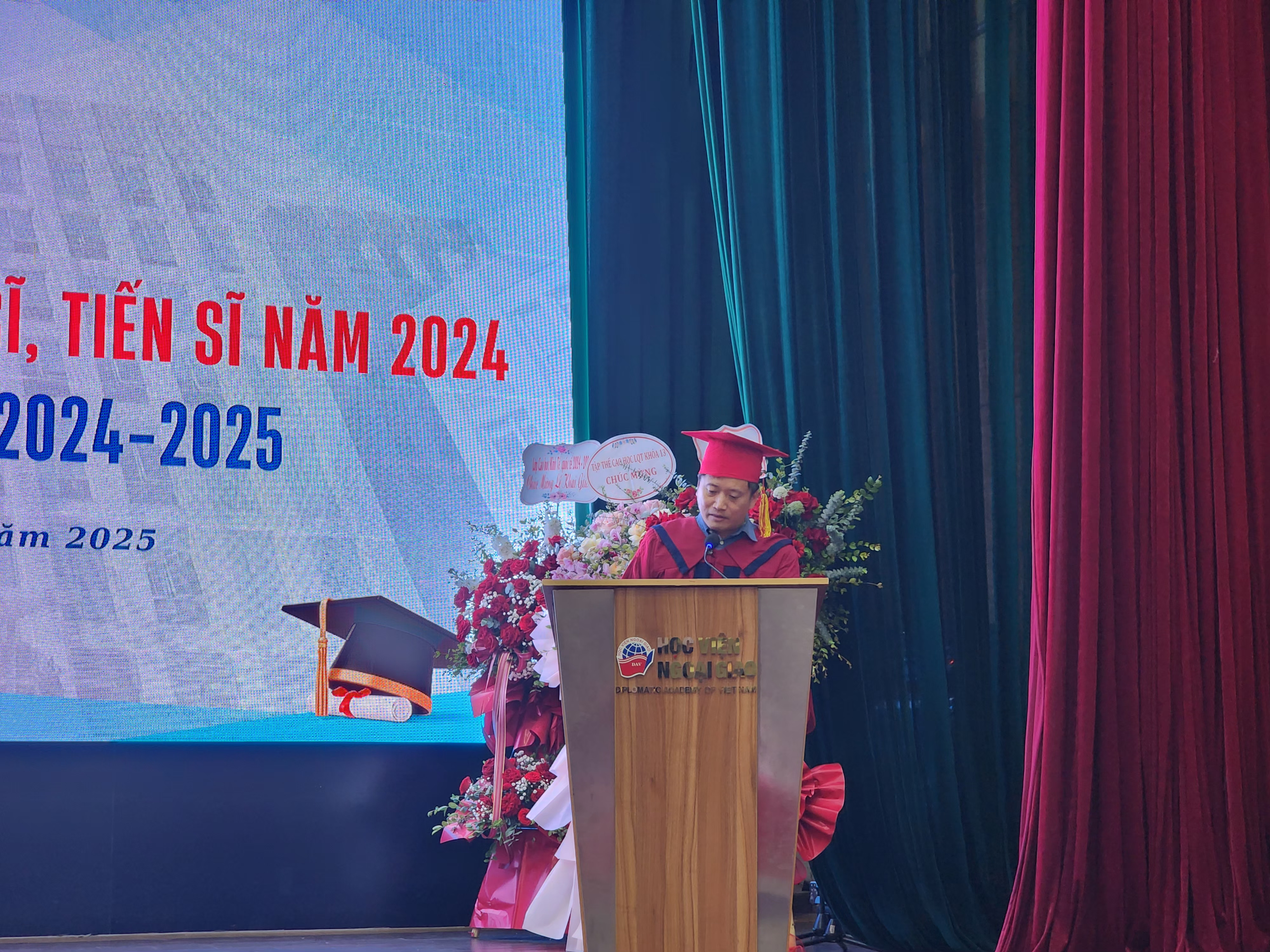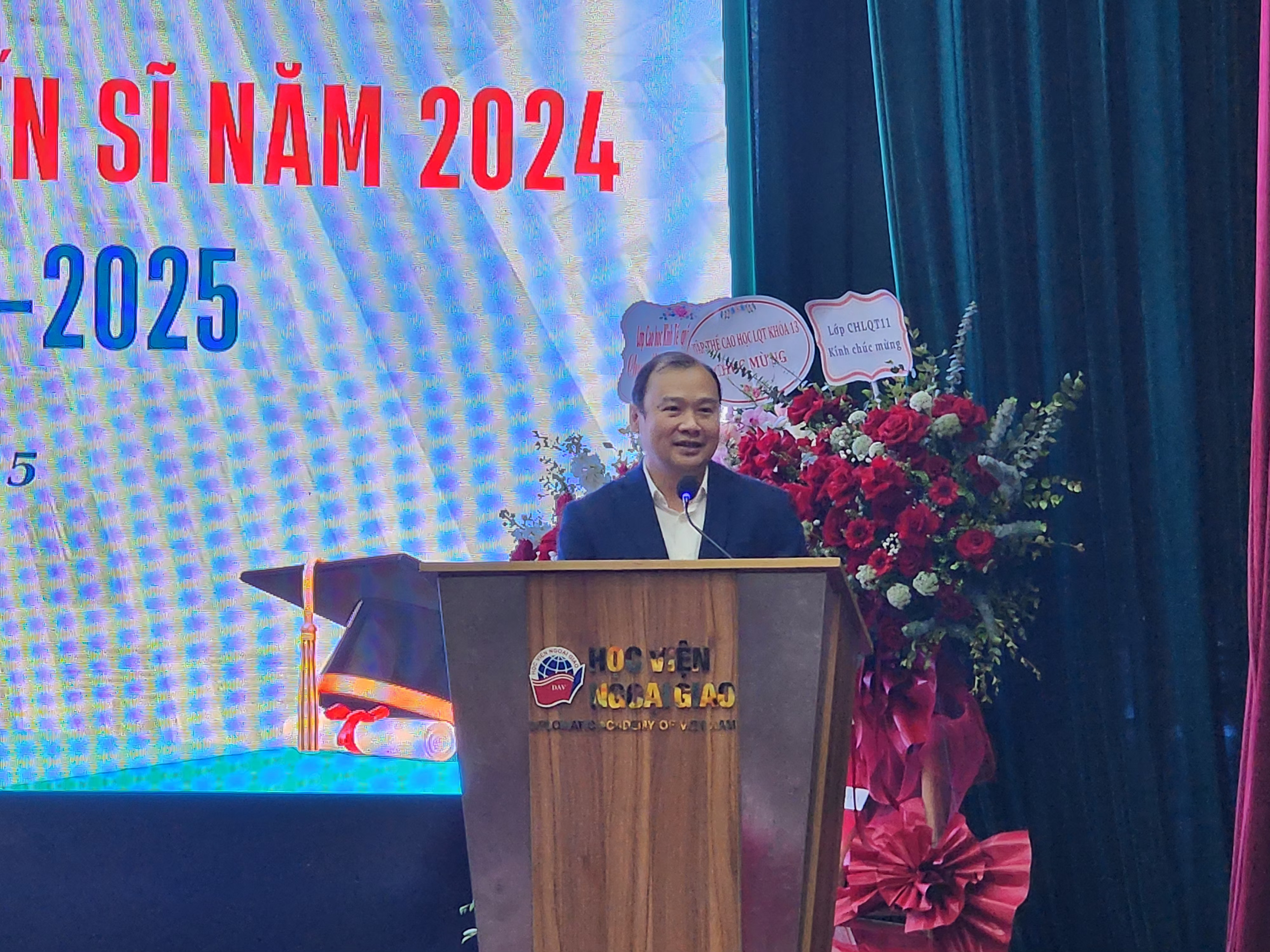In the solemn atmosphere of the ceremony, Dr. Nguyen Hung Son – Acting Director of the Diplomatic Academy, extended heartfelt congratulations to the new Doctors and Masters. He emphasized that they represent an important part of the Academy’s educational mission, expressing his hope that they will continue striving for excellence, becoming role models for future cohorts of doctoral candidates and graduate students, and ultimately evolving into future Associate Professors and Professors.