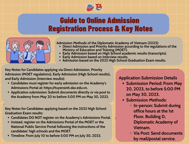 📌 For candidates applying based on the 2023 High School Graduation Examination results: Candidates DO NOT register on the Academy’s admissions portal. Instead, they must register for admission on the Ministry of Education and Training’s system or the National Public Service Portal following the guidance of their high school and MOET, from July 10, 2023 to before 5:00 PM on July 30, 2023.