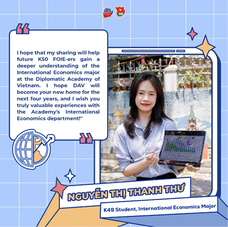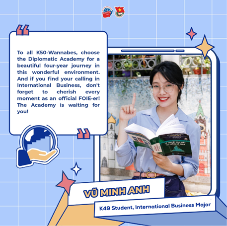 I hope my sharing will help future K50 FOIE-ers gain a better understanding of the International Economics major at the Diplomatic Academy of Vietnam. I hope DAV will be your new destination for the next four years, and I wish you truly valuable experiences with the Academy’s International Economics department!"