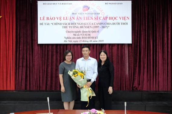 On August 21, 2019, at the Diplomatic Academy of Vietnam, postgraduate student Dao Dinh Ky has successfully defended the Academy-level doctoral thesis specialized in International Relations, code 9.31.02.06 with the topic "Main foreign policy of Cambodia under Prime Minister Hun Sen (1997-2017)”, under the scientific guidance of Assoc. Prof. Dr. Nguyen Thi Que and Dr. Do Thi Thanh Binh.