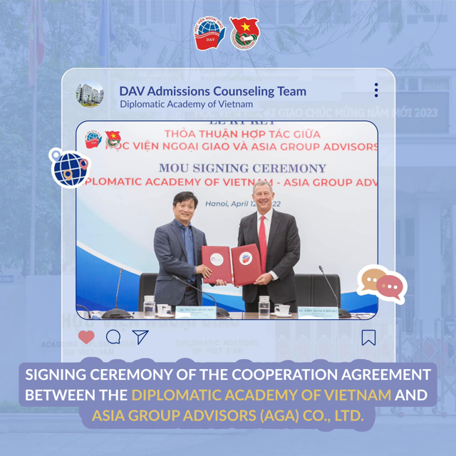 The signing ceremony of the cooperation agreement between the Diplomatic Academy of Vietnam and Asia Group Advisors (AGA) Co., Ltd. contributed to strengthening collaboration in academic consultation, training, career orientation, and recruitment. The agreement opens up many promising opportunities for DAV students while elevating the partnership between the Diplomatic Academy of Vietnam and AGA to a new level.