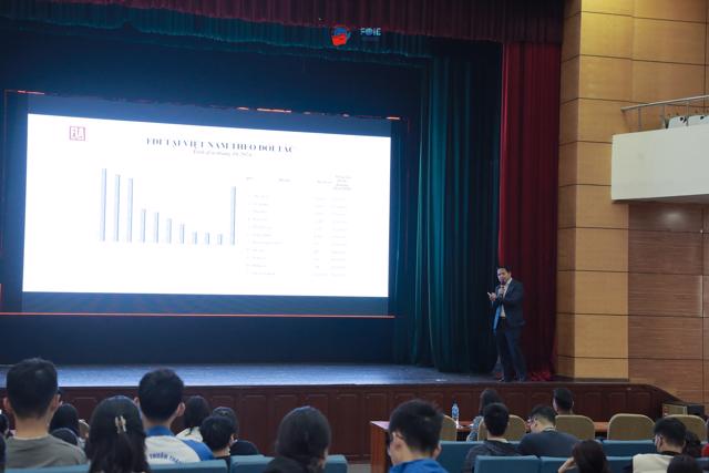 Following the presentation, the Q&A session took place in an energetic and engaging atmosphere. Students raised thoughtful questions on career opportunities, emerging investment trends, and the skills needed to meet future labor market demands. Nguyễn Anh Tuấn offered detailed responses and shared additional insights to help students better understand developments in FDI and the future trajectory of industries in the digital and green transformation era.