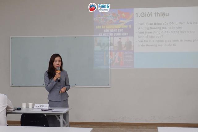A highlight of the event was a case study on successful Vietnamese enterprises in Southeast Asia and South Asia, accompanied by practical experiences in negotiation and overcoming trade barriers. Dr. Lê Thị Mai Anh also opened discussions on career opportunities in international trade and key lessons for students aspiring to pursue economic diplomacy. Following the speaker’s presentation, a lively Q&A session enabled students to engage in deeper reflection and critical thinking on the current state of economic diplomacy in the two regions.