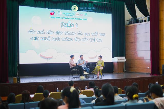 The Talk Show was held on April 19, 2025, at Hall A, Diplomatic Academy of Vietnam. Focusing on two main contents: “Folk Culture – The Key to Nurturing the Souls of Children” and “Folk Culture – A Foothold for Contemporary Creation,” the two speakers shared practical perspectives on how folk culture enters literature—from serving as creative material to its role in nurturing the soul and inspiring creativity. The talk show also discussed how to access and research culture through books, as well as how modern authors can integrate and promote folk values in their works.