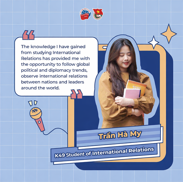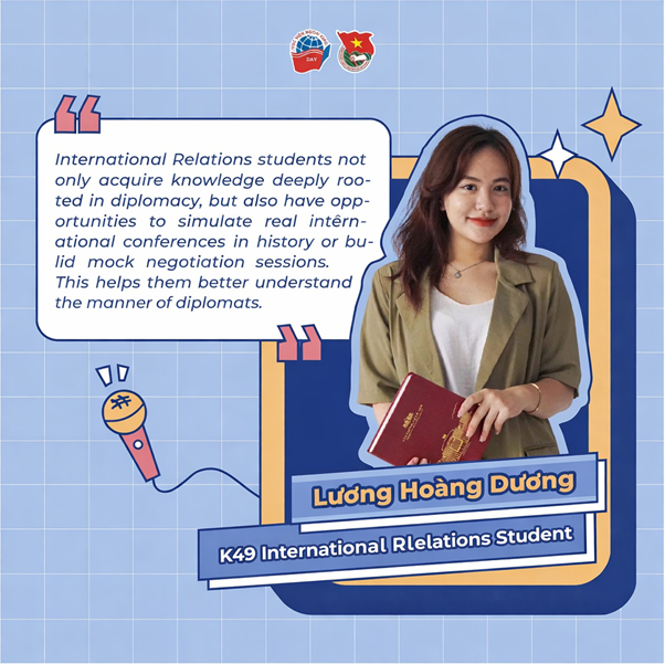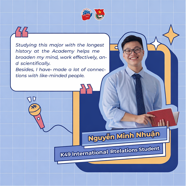💙 With 60 years of experience, the International Relations major is one of the longest-established academic programs at the Diplomatic Academy of Viet Nam. Here, students majoring in International Relations are equipped with in-depth knowledge and professional skills in international relations, foreign policy orientations, and related fields. This foundation contributes to the development of critical thinking and provides students with an objective perspective on the various fields within the diplomatic sector that they aspire to pursue.
