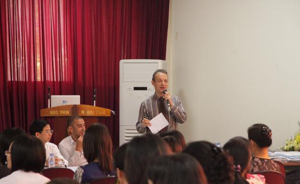Participants from the DAV were Mr. Nguyễn Đình Thao, Vice President; Ms. Nguyễn Thị Thìn, Head of Academic Training Department; Mr. Hoàng Văn Hanh, Dean of the English Faculty; Ms. Kiều Thị Thu Hương, Deputy-Dean of the English Faculty and lecturers from other language departments and centres of the DAV. The invited presenters were Mr. David Persey, Regional expert in English language of the National Geographic Learning, part of Engage Learning publisher and Mr. Richard Hallows, author of the course books entitled “IELTS Express”, together with the participation of Vietnamese lecturers and foreign teachers from other educational institutions in Hanoi.