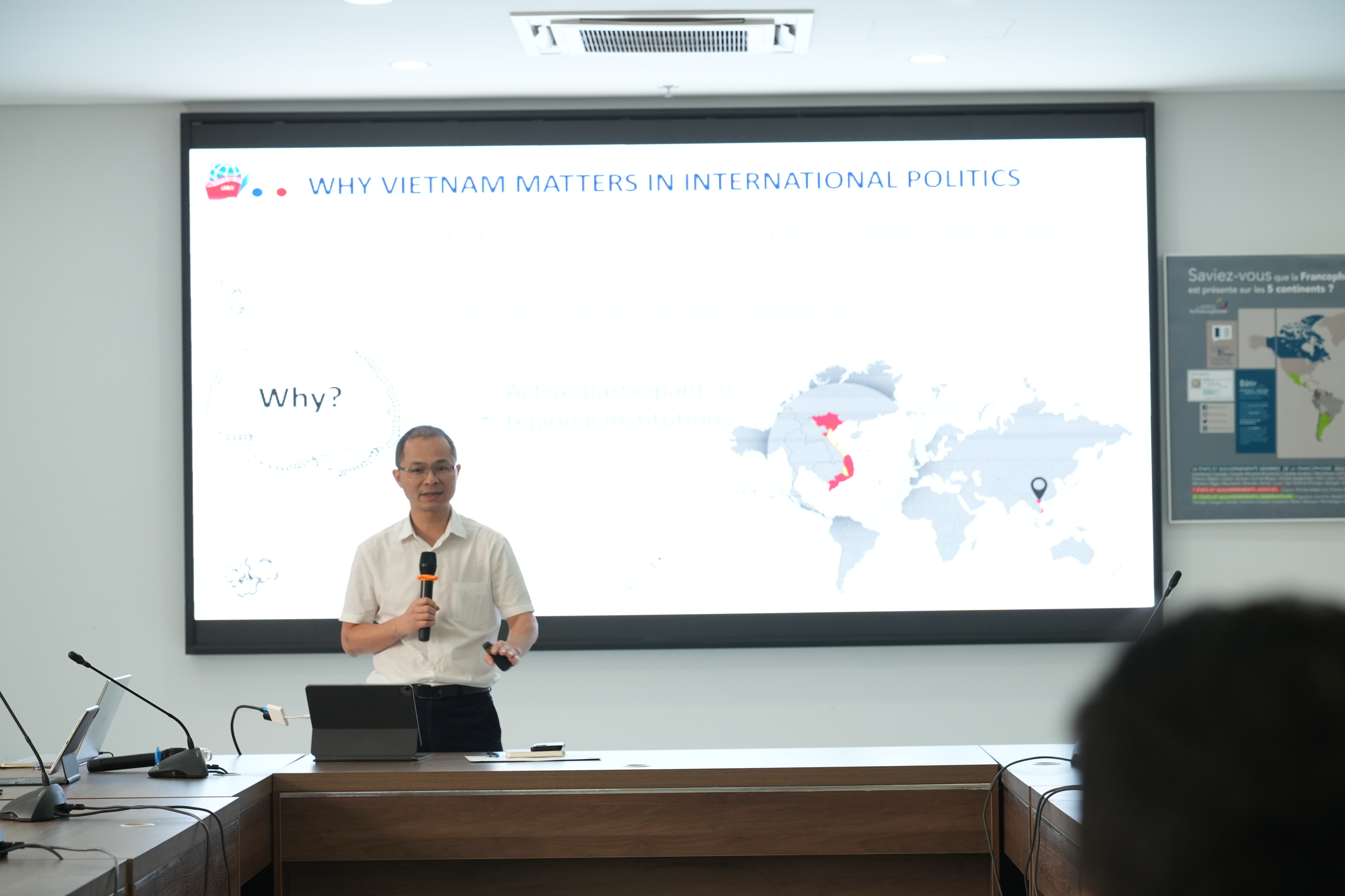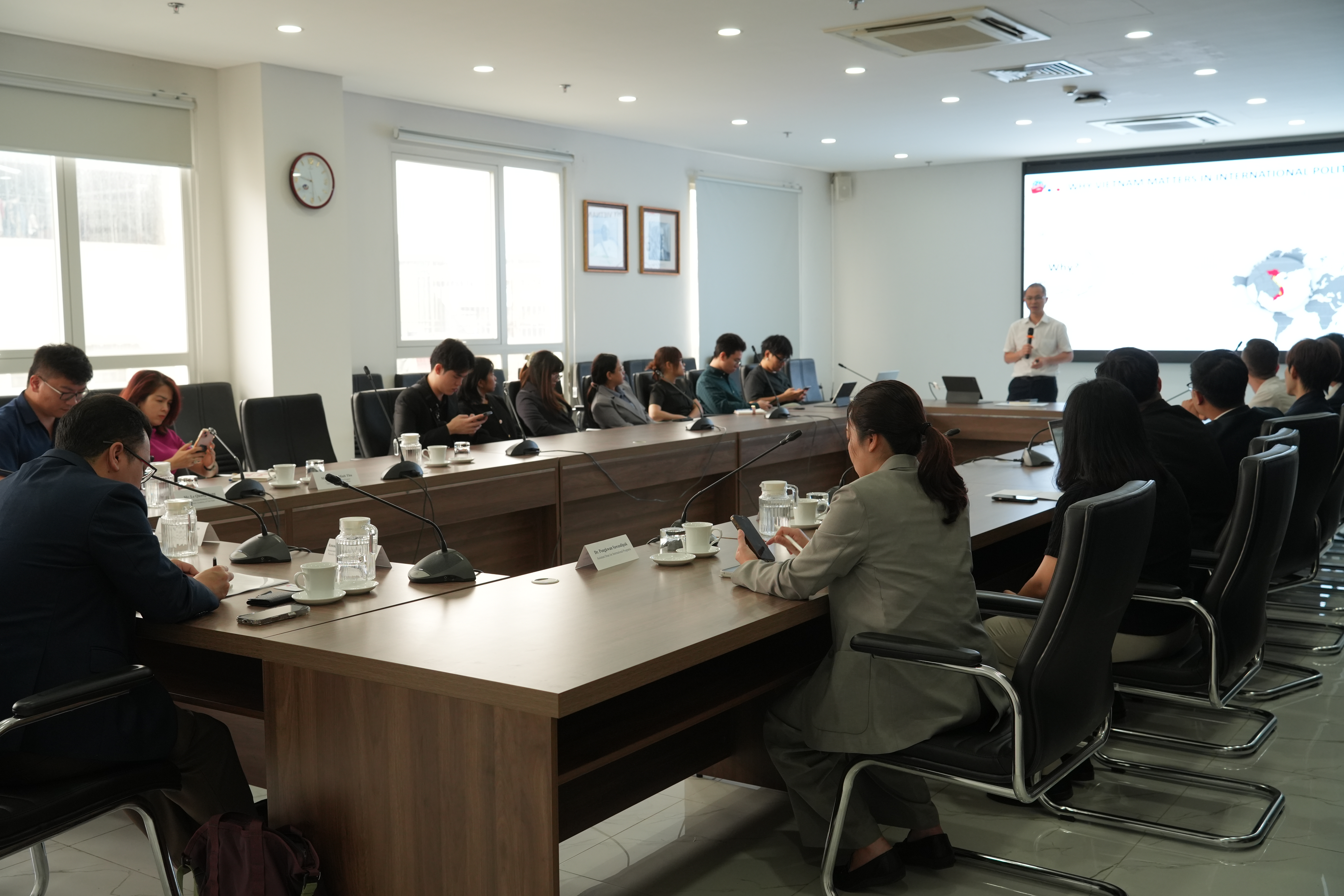 Tiếp nối chương trình, PGS.TS. Hà Anh Tuấn, Q. Trưởng Khoa Chính trị Quốc tế & Ngoại giao, đã trình bày chuyên đề về “Chính sách đối ngoại của Việt Nam”, thu hút sự tham gia sôi nổi từ phía đoàn khách trong phần hỏi đáp.