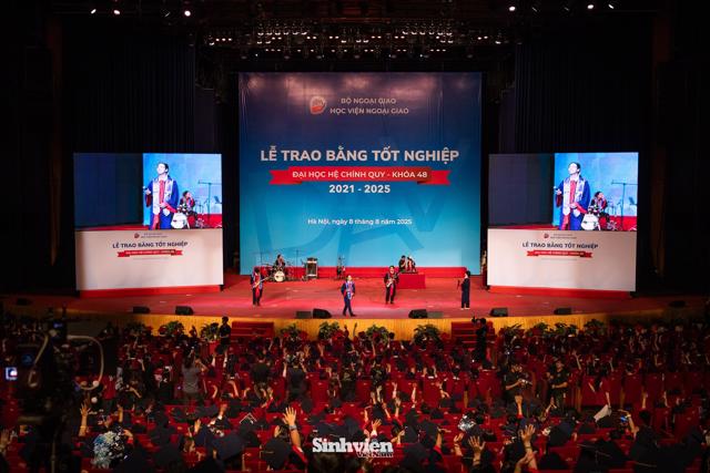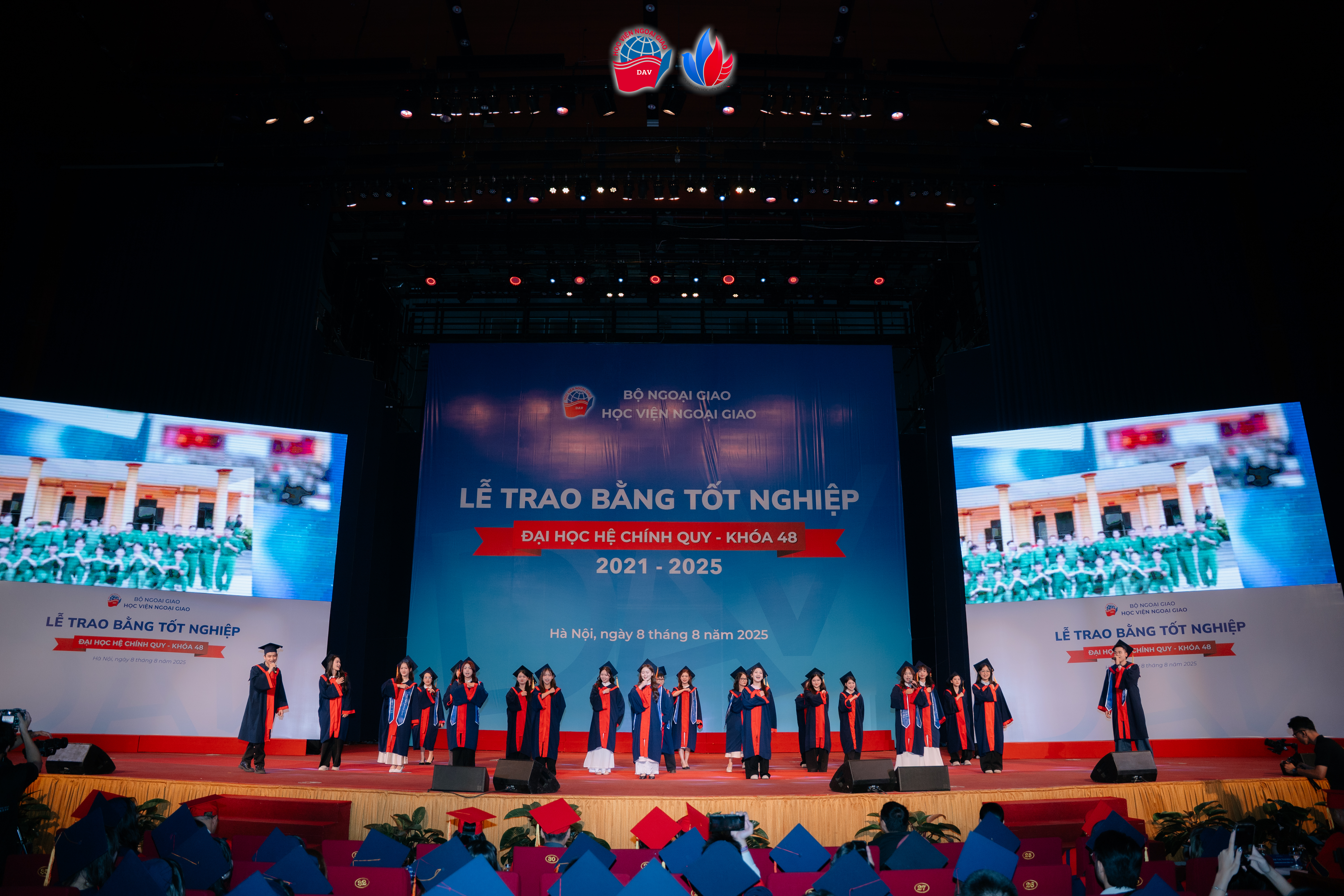 Sáng 8/8/2025, tại Trung tâm Hội nghị Quốc gia, Học viện Ngoại giao đã long trọng tổ chức Lễ Tốt nghiệp và trao bằng cho hơn 1.200 tân cử nhân khóa 48, niên khóa 2021-2025 và 13 cử nhân tốt nghiệp ngành 2. Buổi lễ diễn ra trong không khí trang trọng, ấm áp với sự hiện diện của đại diện các đơn vị của Bộ Ngoại giao, Ban Giám đốc Học viện, lãnh đạo các khoa, viện, đơn vị chức năng, quý thầy cô, các bậc phụ huynh và đông đảo sinh viên. Đây là cột mốc quan trọng, khép lại hành trình bốn năm học tập và rèn luyện của một lứa sinh viên đặc biệt - các bạn trẻ đã trải qua thời kỳ học phổ thông trung học và những năm tháng đầu đại học trong hoàn cảnh đại dịch COVID-19.
