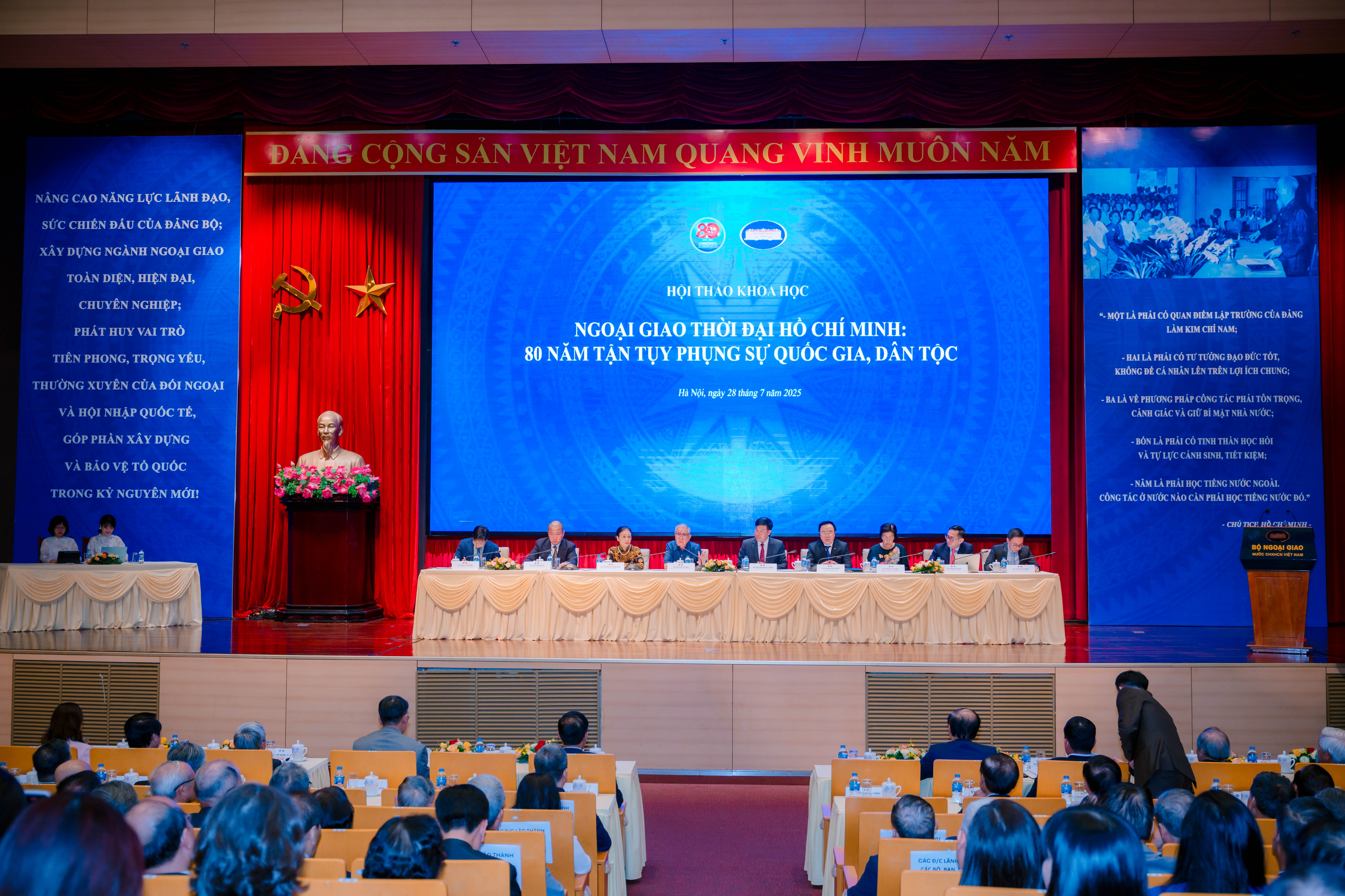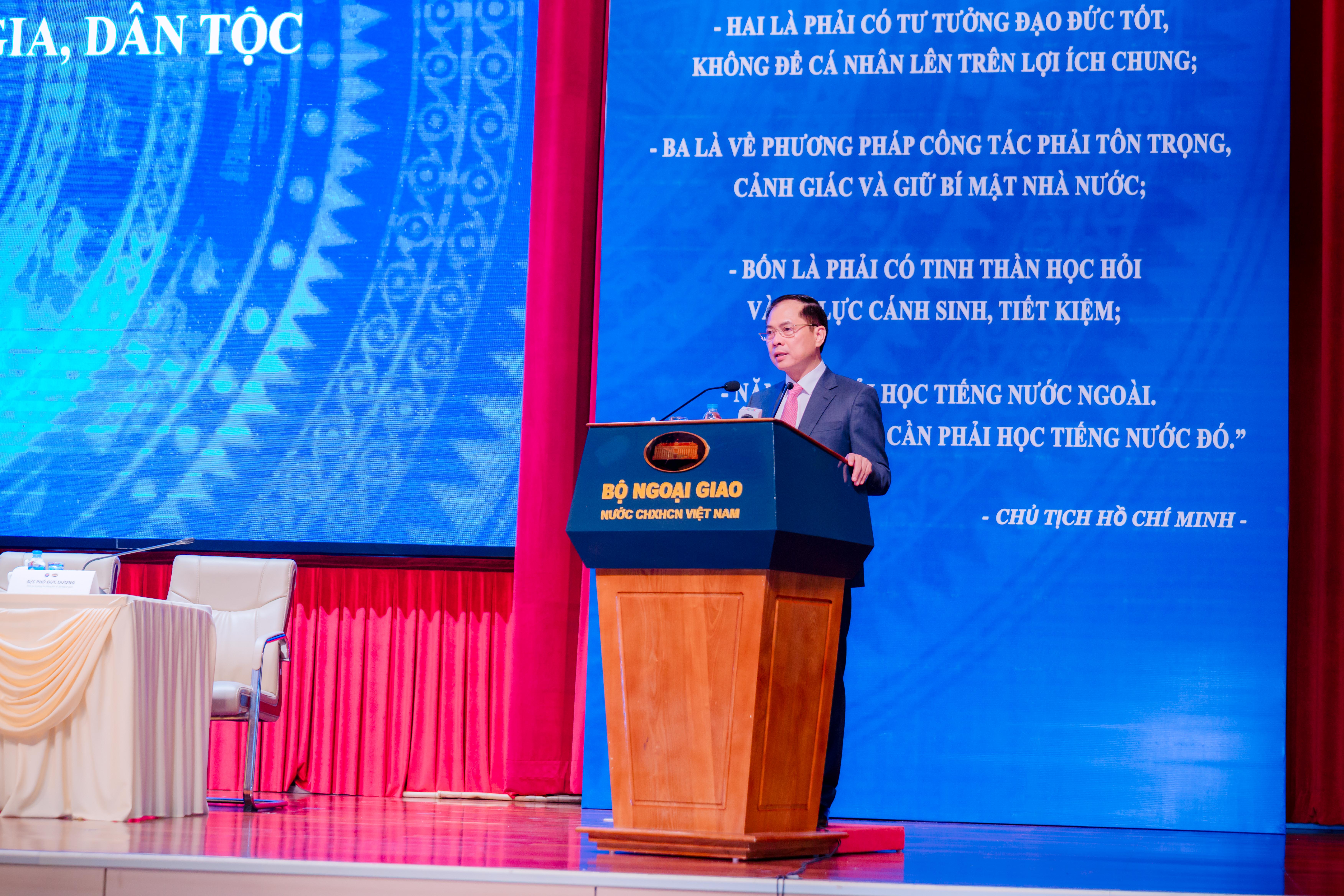 Phát biểu khai mạc Hội thảo, đồng chí Bùi Thanh Sơn, Uỷ viên Trung ương Đảng, Phó Thủ tướng Chính phủ, Bí thư Đảng uỷ, Bộ trưởng Bộ Ngoại giao nhấn mạnh: Ngành Ngoại giao có vinh dự vô cùng đặc biệt, Chủ tịch Hồ Chí Minh là Bộ trưởng Bộ Ngoại giao đầu tiên, trực tiếp chỉ đạo, rèn luyện và dìu dắt kể từ những ngày đầu được thành lập. Kế thừa truyền thống ngoại giao của ông cha trong lịch sử dựng nước và giữ nước, dưới ánh sáng của Đảng và tư tưởng ngoại giao Hồ Chí Minh, suốt chặng đường 80 năm qua, Ngoại giao Việt Nam đã luôn tận tụy phụng sự quốc gia, dân tộc, có nhiều đóng góp xứng đáng vào những thành tựu chung, có ý nghĩa lịch sử của đất nước. Đó là góp phần xứng đáng vào việc hoàn thành thắng lợi sự nghiệp đấu tranh giành độc lập dân tộc, thống nhất đất nước; cụ thể hoá các thắng lợi trên chiến trường thành thắng lợi trên bàn đàm phán, chấm dứt chiến tranh. Sau khi nước nhà thống nhất, Ngoại giao Việt Nam luôn khẳng định vai trò tiên phong trong việc duy trì môi trường hòa bình, ổn định, thu hút các nguồn lực và điều kiện thuận lợi bên ngoài phục vụ hai nhiệm vụ chiến lược là xây dựng và bảo vệ Tổ quốc. Ngoại giao đã không ngừng góp phần quan trọng nâng cao vị thế đất nước, đưa Việt Nam từ chỗ không có tên trên bản đồ chính trị thế giới đến vai trò, vị trí ngày càng tăng trong nền chính trị thế giới, kinh tế toàn cầu và văn minh nhân loại. Với bề dày thành tích của mình, đối ngoại được Lãnh đạo Đảng và Nhà nước đánh giá là điểm sáng đầy ấn tượng trong thành tựu chung của đất nước. Sau 8 thập kỷ, từ chỗ “thân cô thế cô”, đất nước chưa bao giờ có được cơ đồ, vị thế, tiềm lực và uy tín quốc tế như ngày nay.