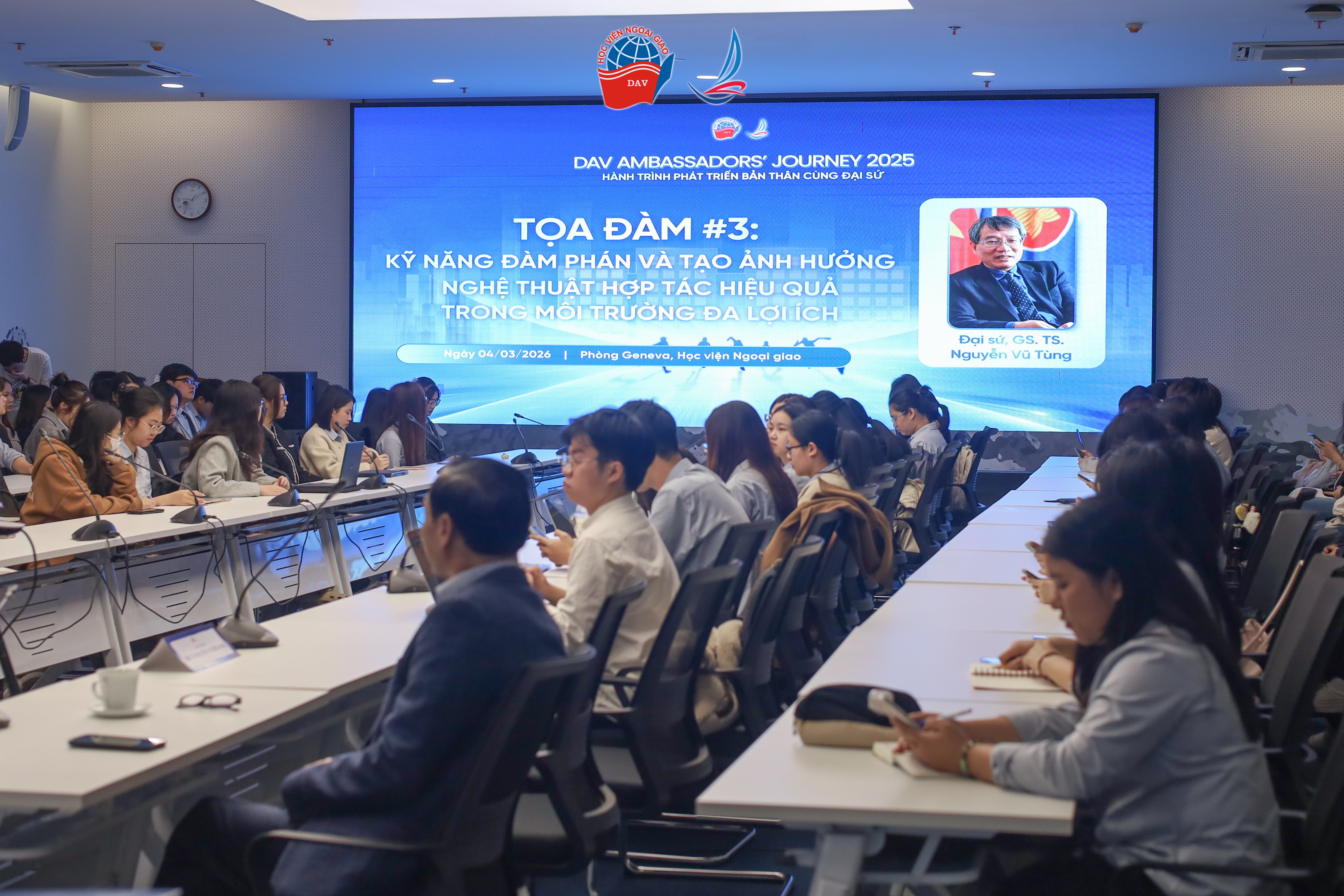 Ngày 04/3/2026, Ambassador’s Talk #3 với chủ đề “Kỹ năng đàm phán và tạo ảnh hưởng - Nghệ thuật hợp tác hiệu quả trong môi trường đa lợi ích”, dưới sự chủ trì của Đại sứ, GS.TS. Nguyễn Vũ Tùng, đã diễn ra trong không khí trao đổi cởi mở và thu hút sự tham gia tích cực của đông đảo sinh viên.
