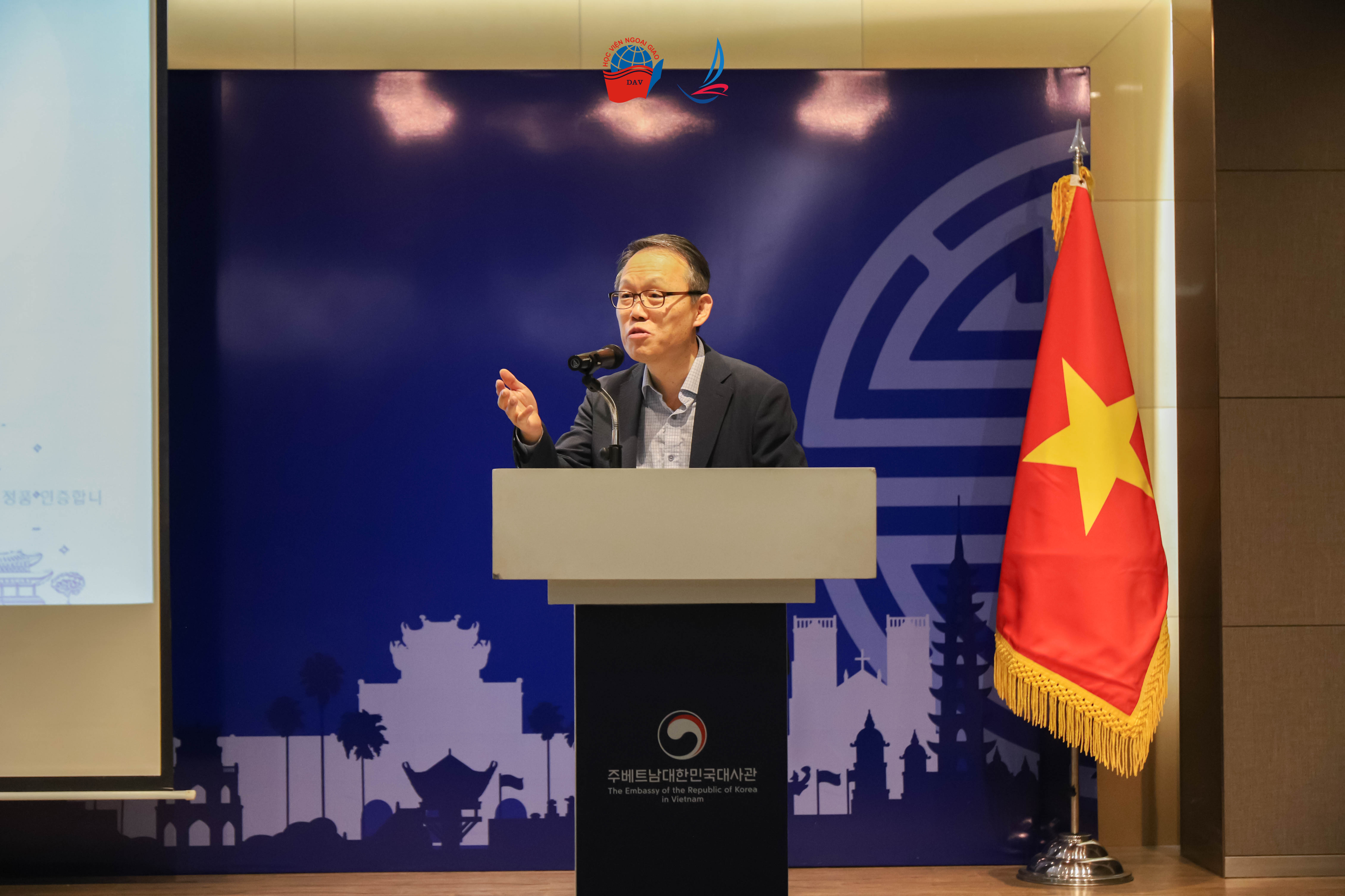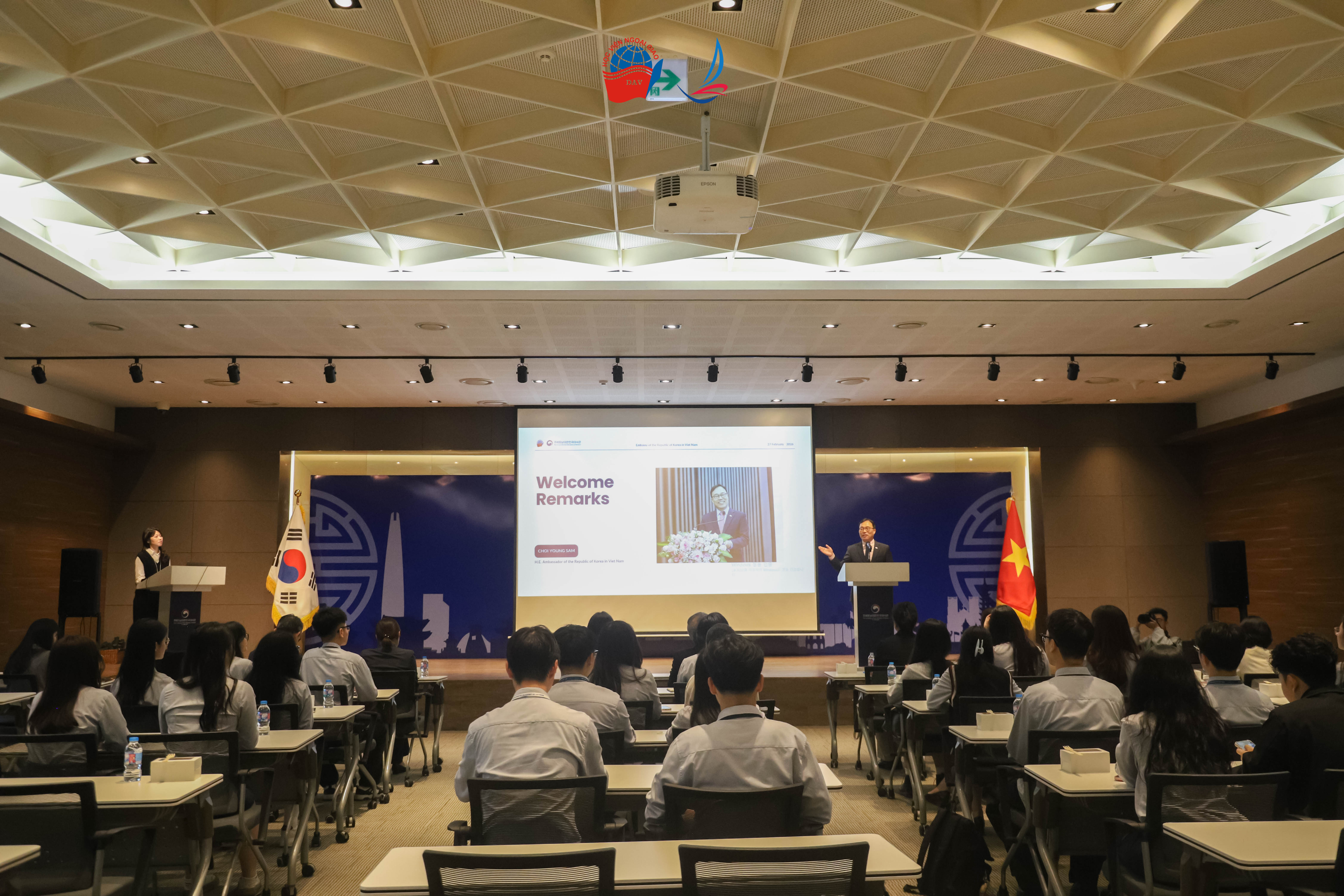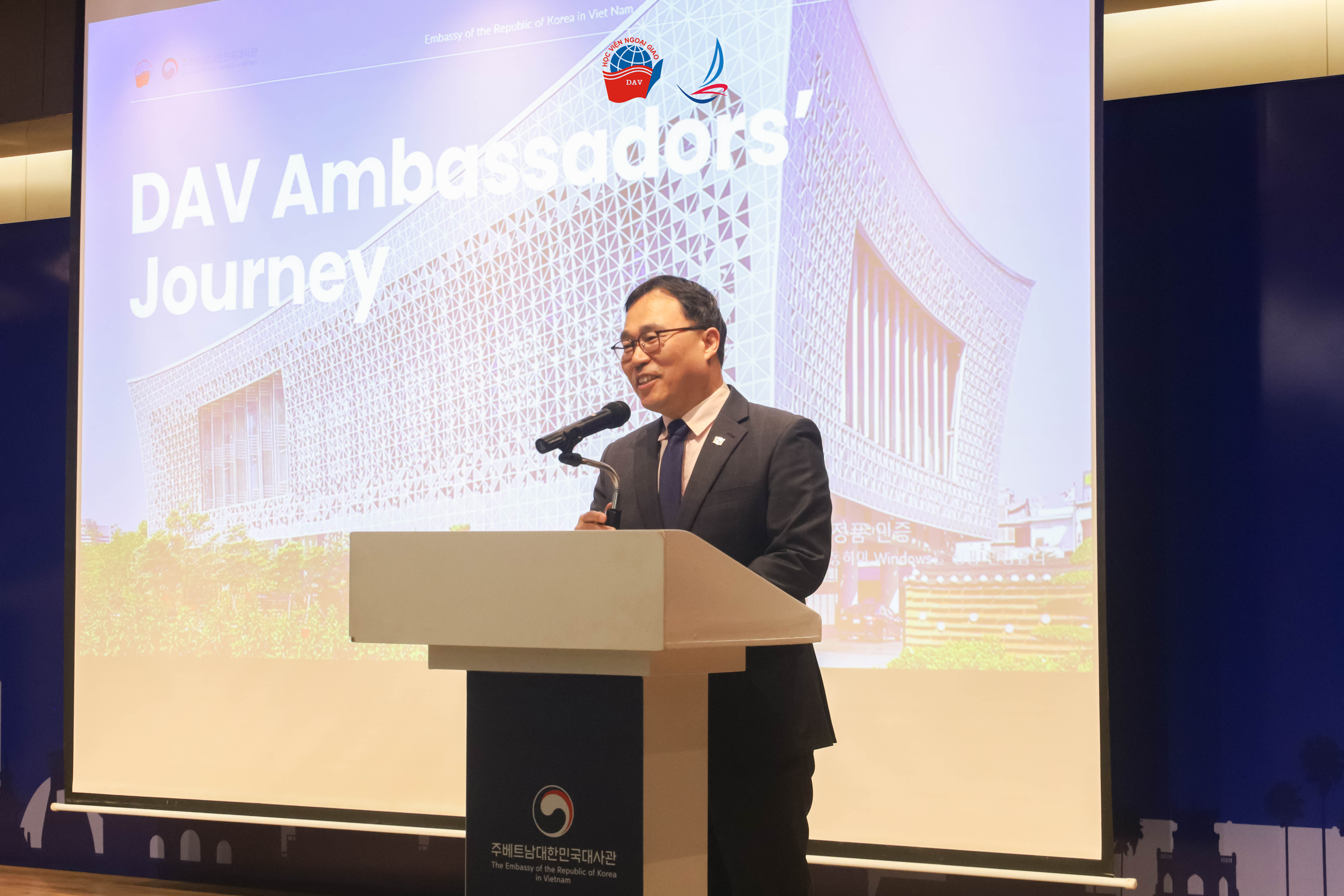 Phát biểu chào mừng đoàn Học viện Ngoại giao, Ngài Đại sứ Choi Young Sam bày tỏ niềm vui khi được đón tiếp Đại sứ, GS.TS. Nguyễn Vũ Tùng cùng các cán bộ, giảng viên và học viên Khóa học DAV Ambassadors’ Journey 2025. Ngài đồng thời nhấn mạnh vai trò quan trọng của thế hệ trẻ trong việc kế thừa, vun đắp và tiếp tục phát triển quan hệ hợp tác tốt đẹp giữa Việt Nam và Hàn Quốc.