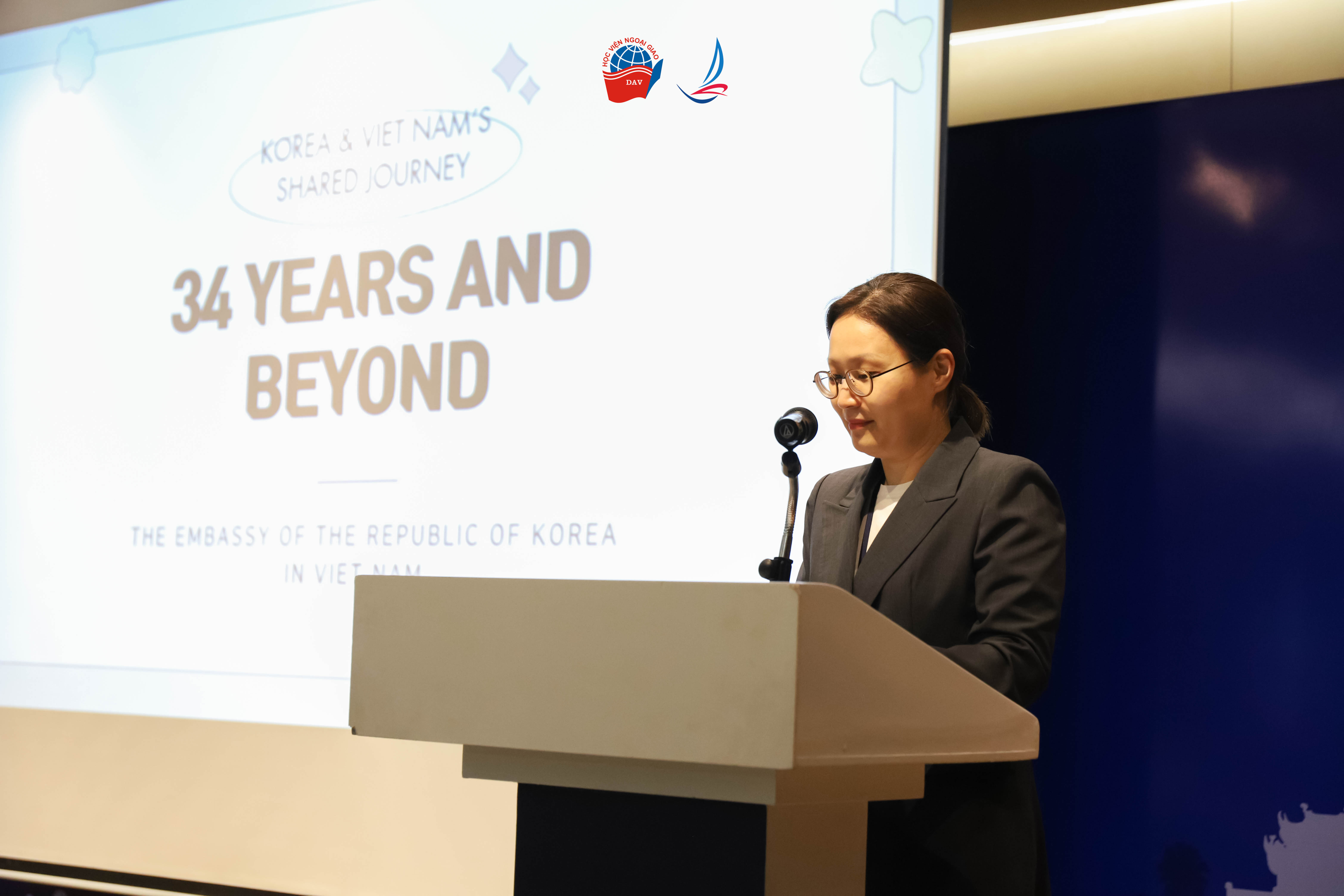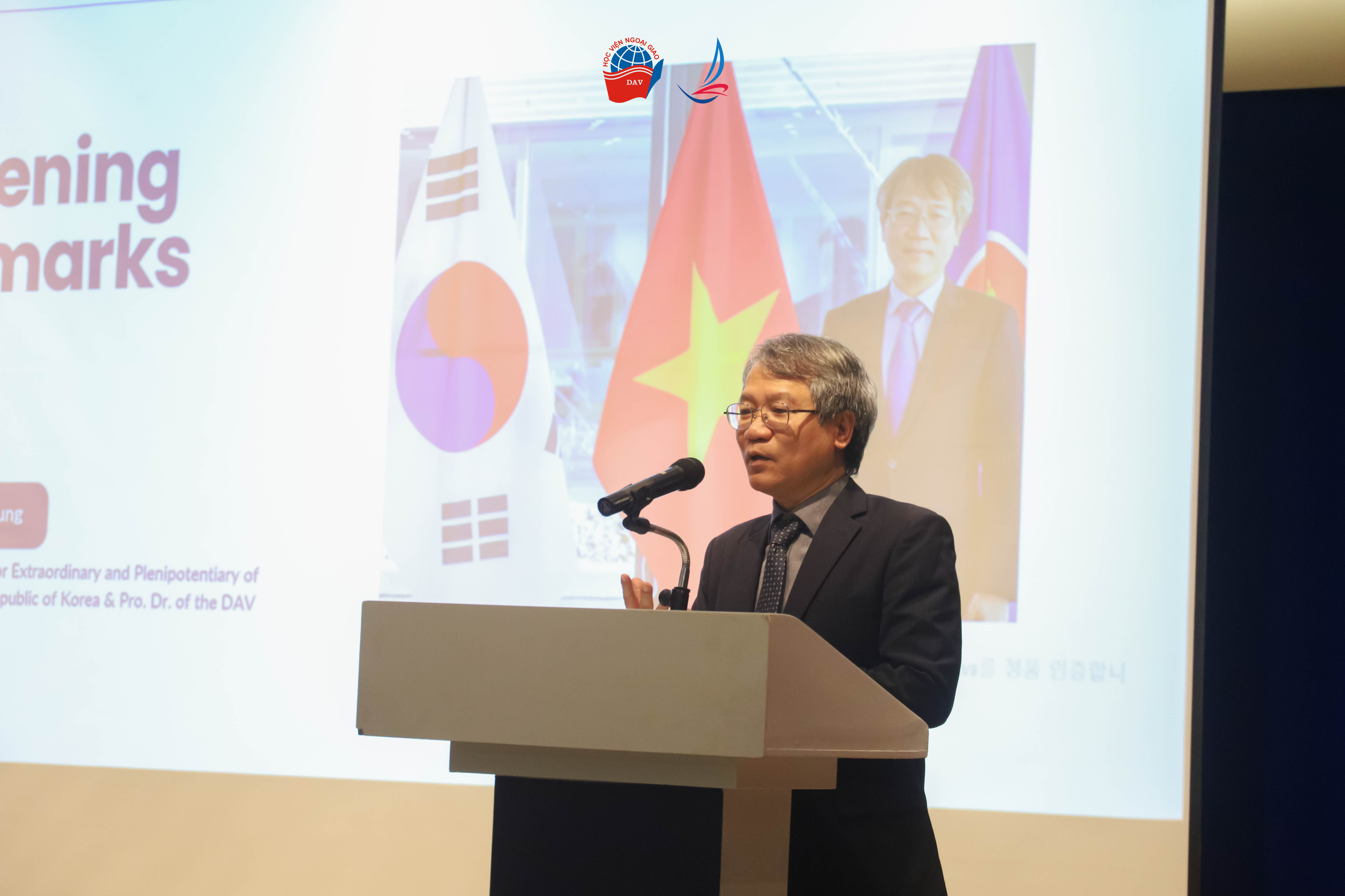 Trong Phiên thảo luận I với chủ đề “Quan hệ Việt Nam - Hàn Quốc”, Tham tán Chính trị Han Young Hee đã trình bày tổng quan về lịch sử thiết lập và phát triển quan hệ ngoại giao giữa hai nước, nhấn mạnh các dấu mốc quan trọng cũng như những lĩnh vực hợp tác chủ chốt như chính trị - ngoại giao, kinh tế, văn hóa, giáo dục và giao lưu nhân dân. Tiếp đến, Đại sứ, GS.TS. Nguyễn Vũ Tùng cũng chia sẻ những trải nghiệm thực tiễn trong nhiệm kỳ công tác tại Hàn Quốc, mang đến góc nhìn sâu sắc và sinh động về hoạt động ngoại giao song phương trong bối cảnh khu vực và quốc tế có nhiều biến động.