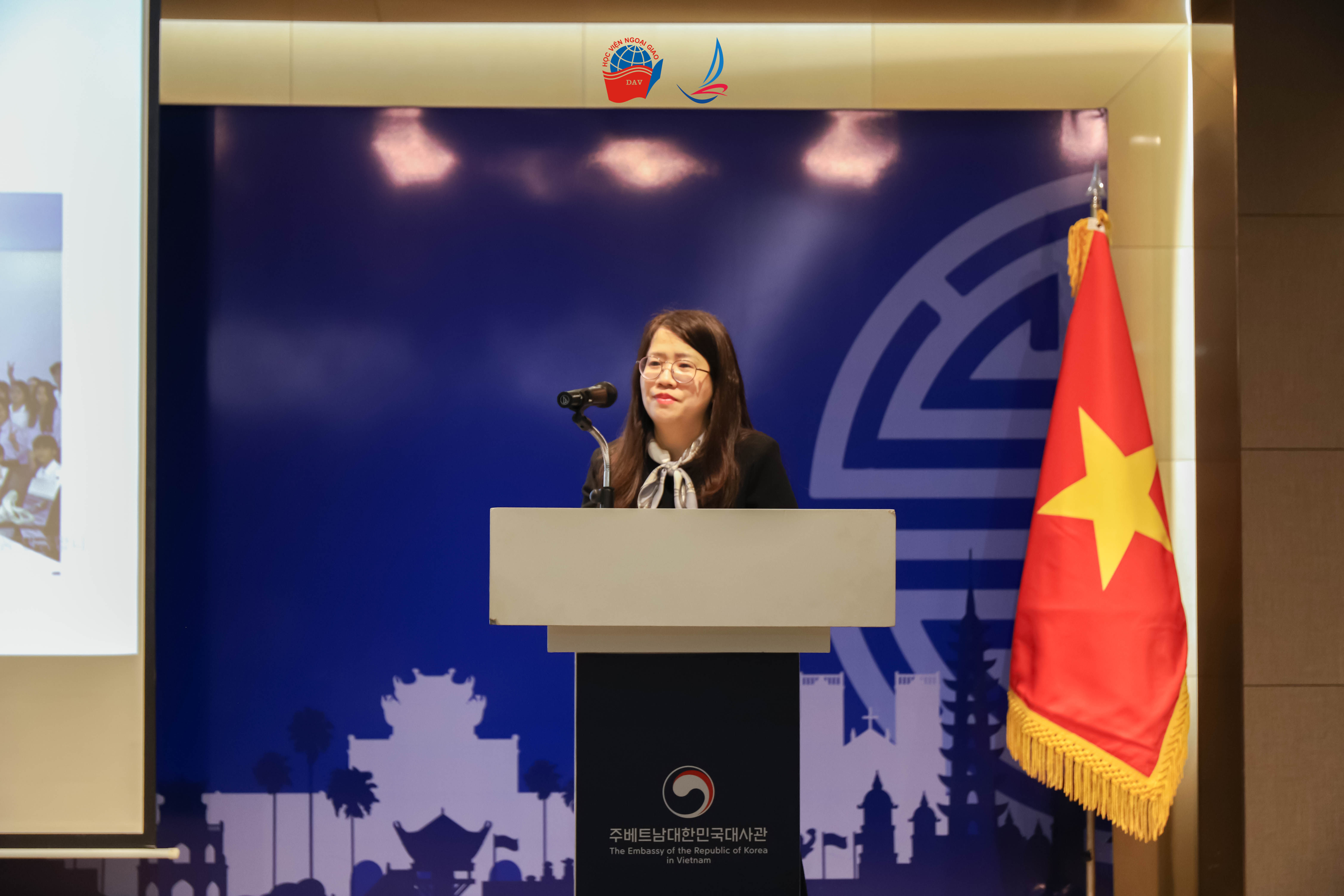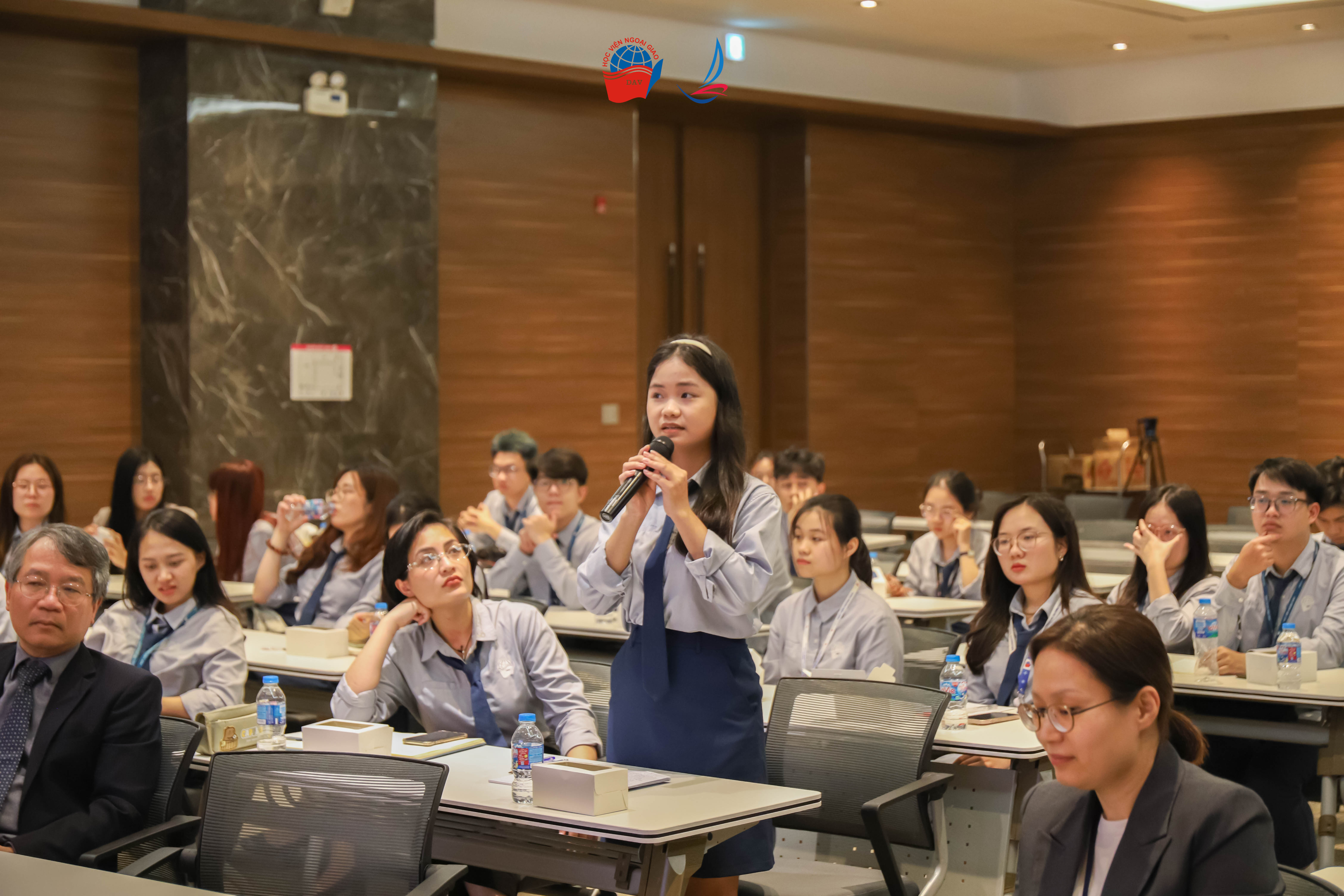 Tiếp nối chương trình, Phiên thảo luận II với chủ đề “Văn hóa Hàn Quốc và Du học Hàn Quốc” đã mở ra không gian trao đổi sôi nổi, mang đến nhiều thông tin bổ ích cho các học viên. Đại diện Đại sứ quán và Trung tâm Giáo dục Hàn Quốc tại Hà Nội đã giới thiệu những nét đặc trưng tiêu biểu của văn hóa Hàn Quốc, đồng thời chia sẻ về các chương trình học bổng và cơ hội du học hấp dẫn dành cho sinh viên Việt Nam. Tại phiên thảo luận, cô Hoàng Mai Hương - Trưởng phòng Đào tạo Đại học, Học viện Ngoại giao - cũng đã giới thiệu tổng quan về chương trình Hàn Quốc học tại Học viện, qua đó giúp học viên có thêm góc nhìn toàn diện về cơ hội học tập và nghiên cứu trong lĩnh vực này.