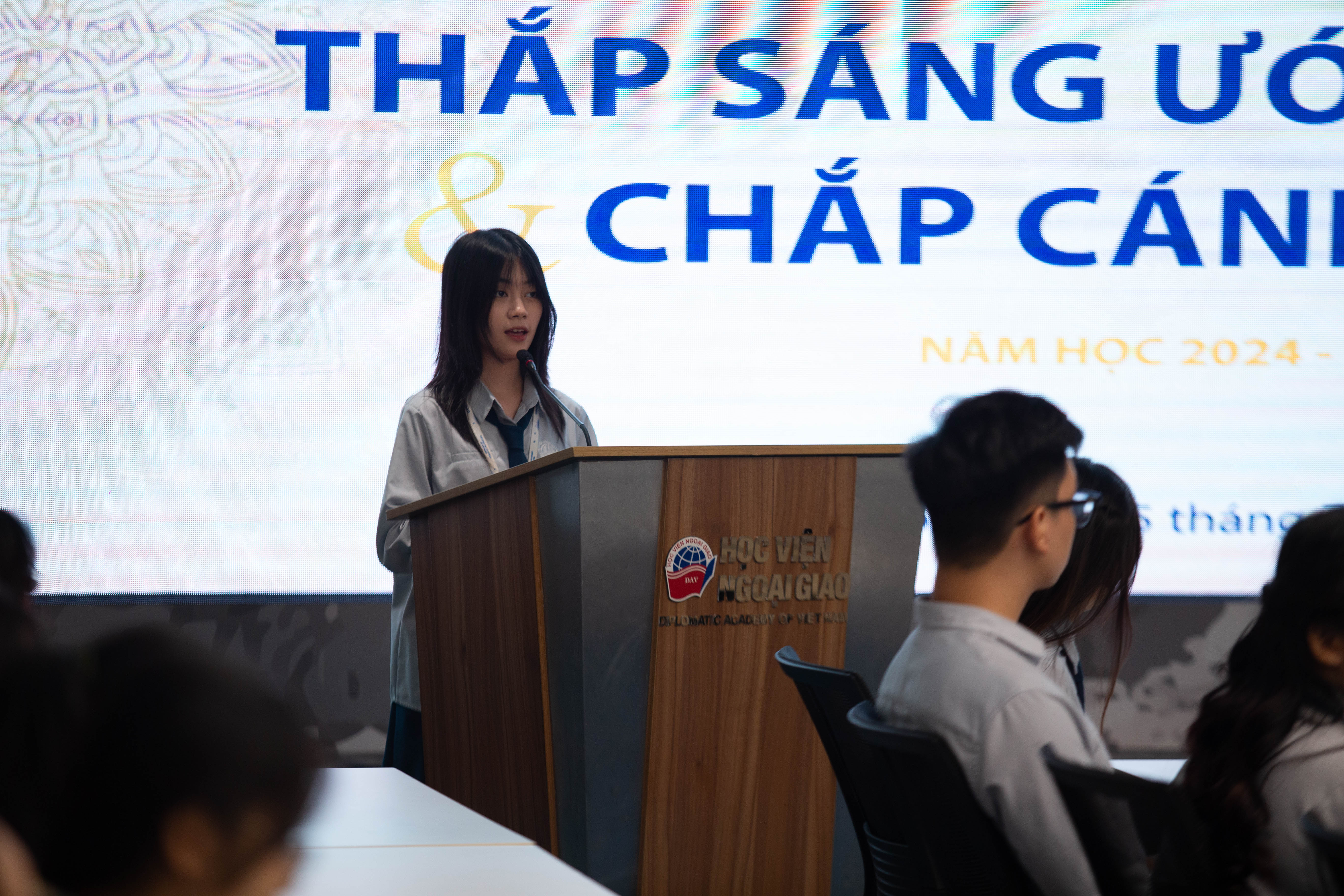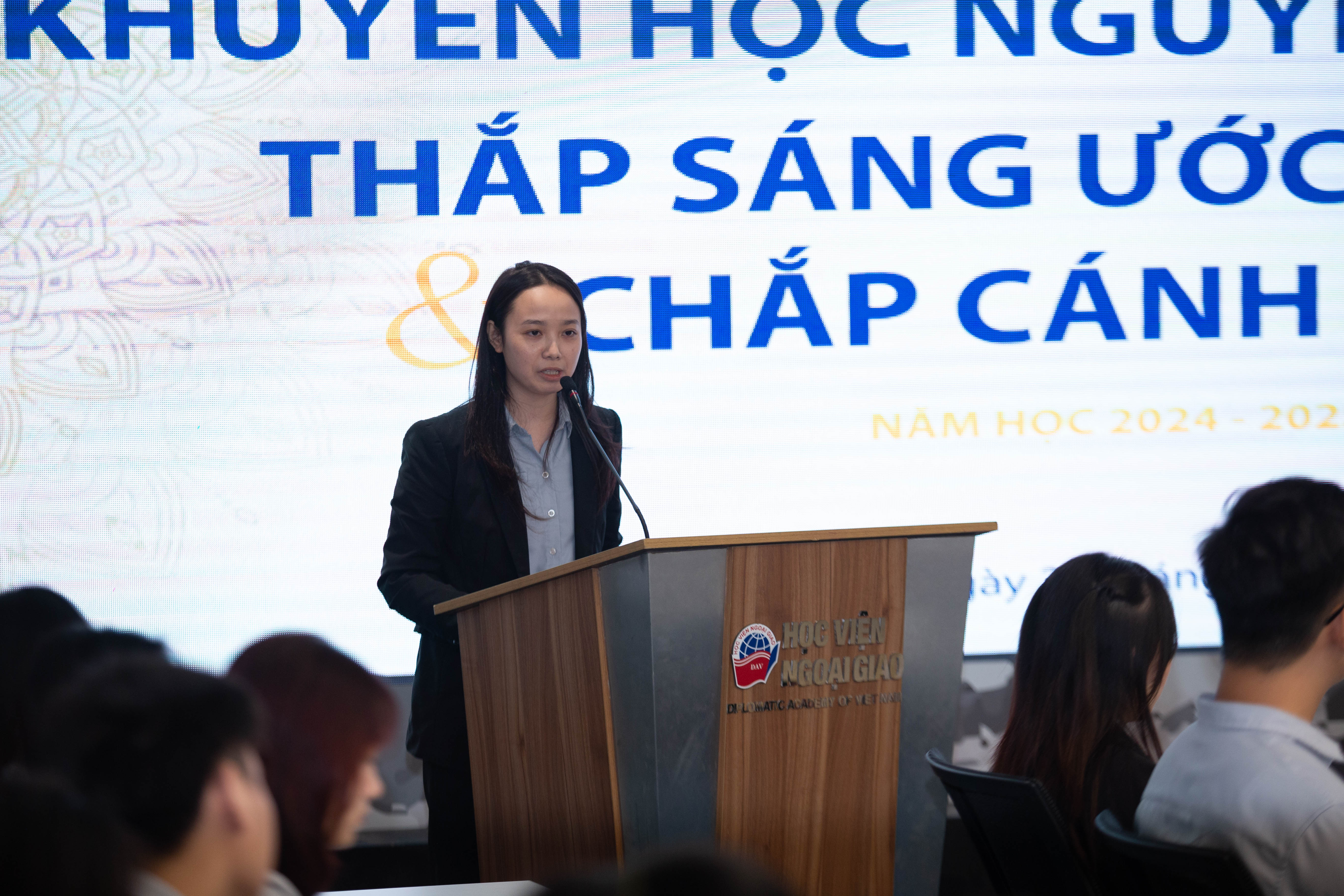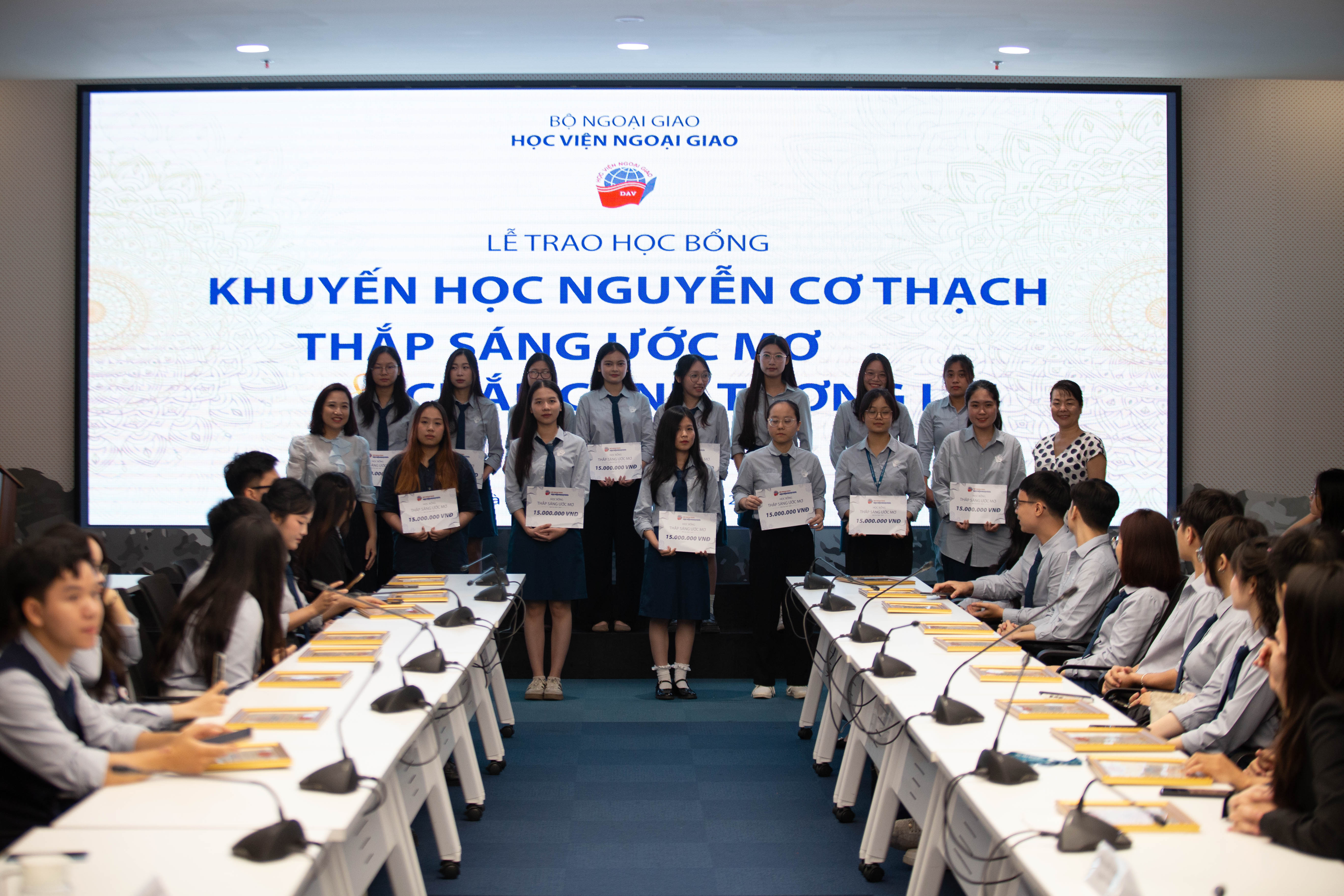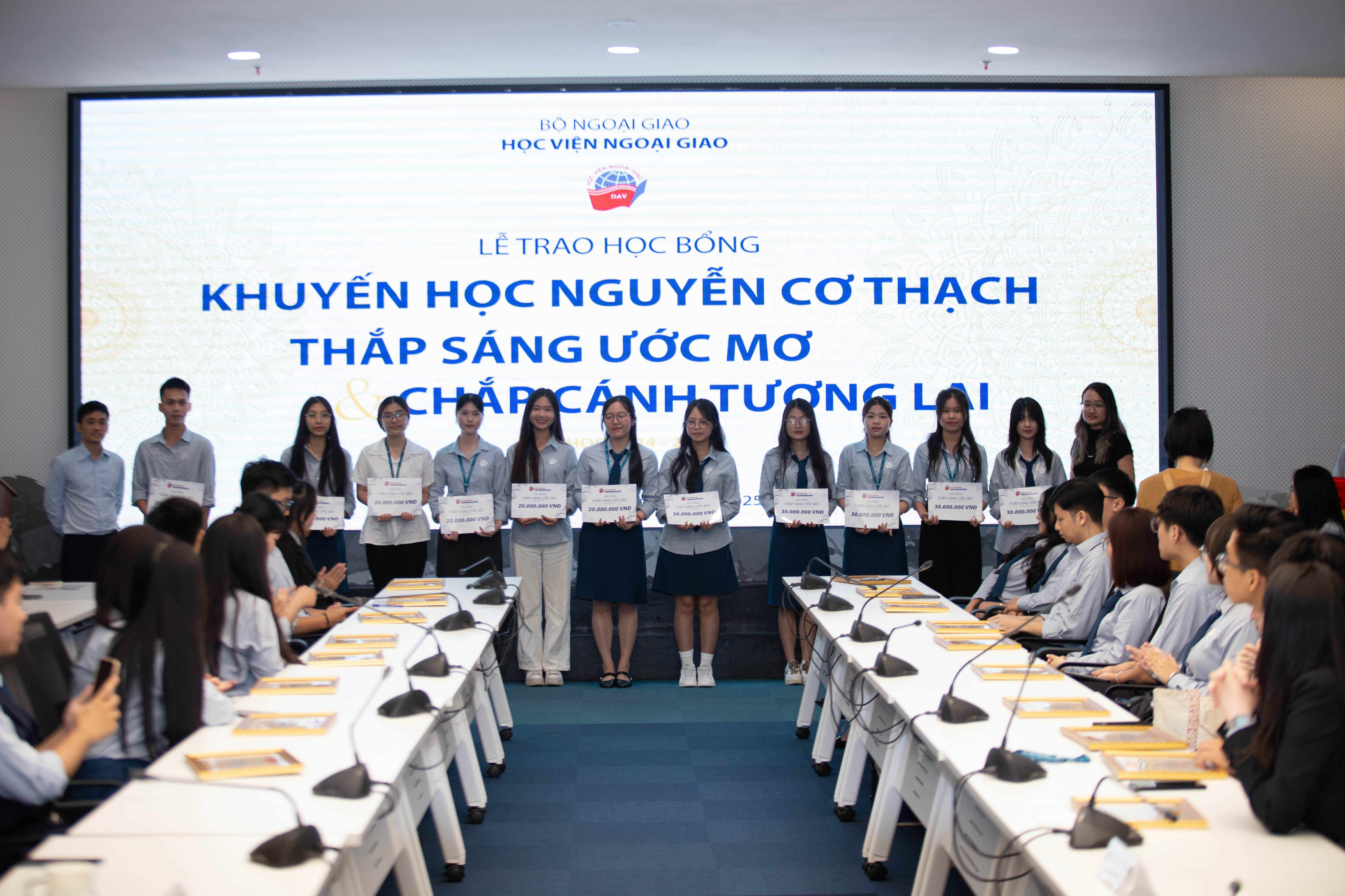 Tiếp sau phần chia sẻ của các bạn sinh viên buổi lễ tiếp tục với phần vinh danh những cá nhân xuất sắc nhận Học bổng Khuyến học Nguyễn Cơ Thạch. Đây là một trong những chương trình học bổng danh giá của Học viện Ngoại giao hướng tới tôn vinh những sinh viên đạt thành tích xuất sắc trong học tập, nghiên cứu khoa học, có tố chất lãnh đạo và đóng góp tích cực cho cộng đồng sinh viên. Sau quá trình xét tuyển nghiêm túc và minh bạch, Hội đồng đã lựa chọn 20 gương mặt sinh viên tiêu biểu để trao học bổng.