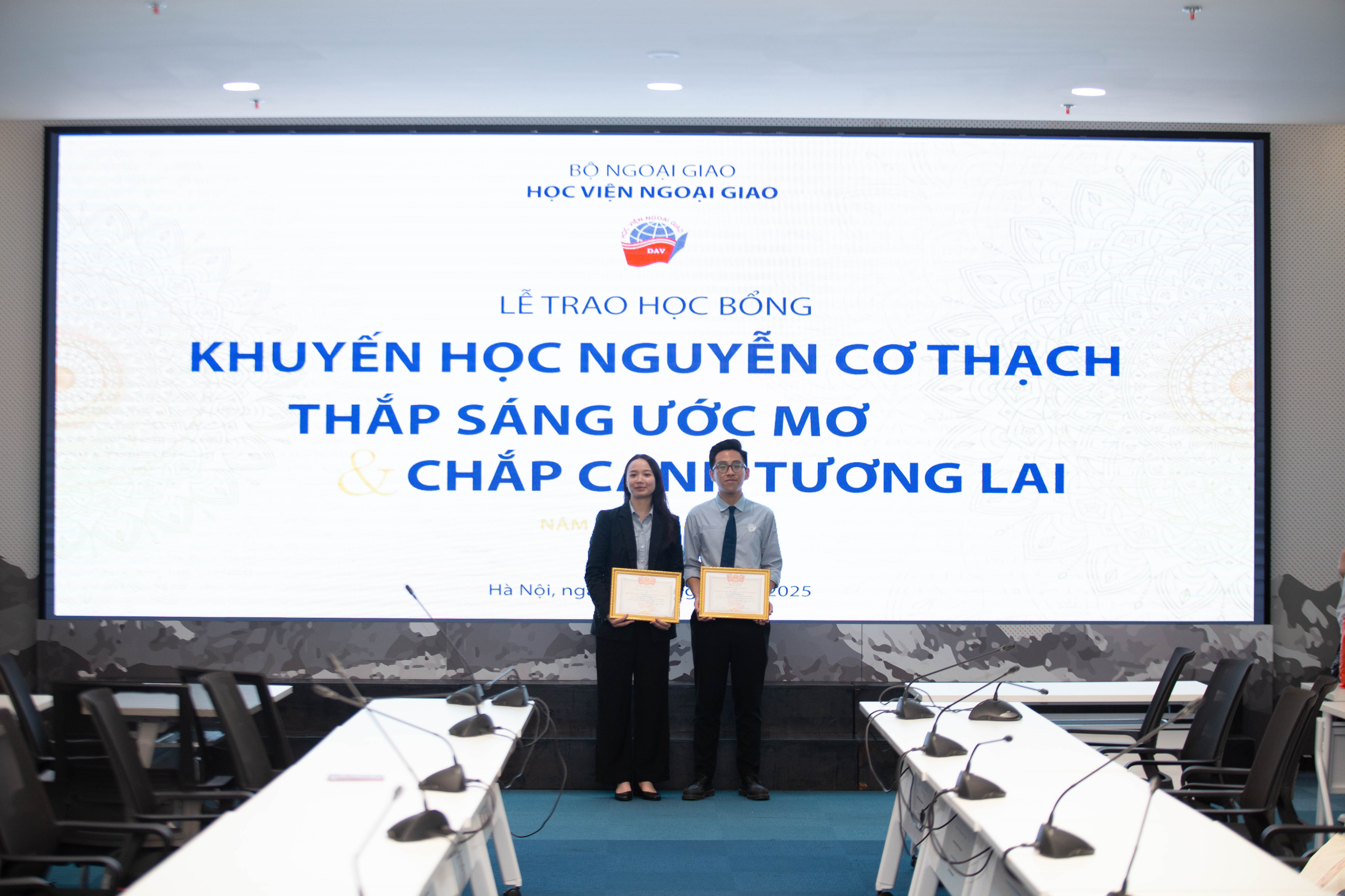 Sáng ngày 25/07/2025 Học viện Ngoại giao đã tổ chức Lễ trao Học bổng Khuyến học Nguyễn Cơ Thạch, học bổng “Chắp cánh tương lai” và học bổng “Thắp sáng ước mơ” năm 2025.