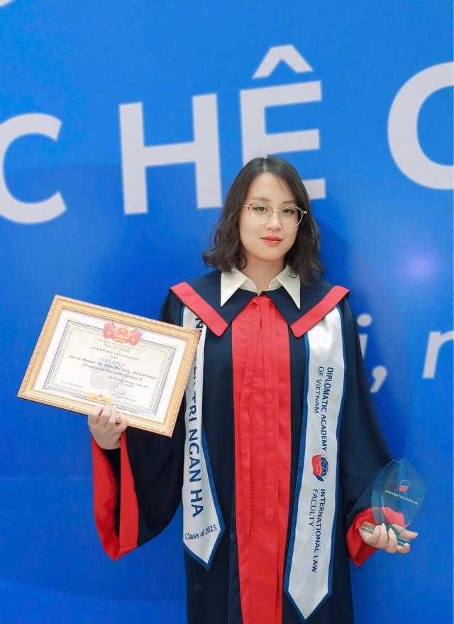 Mình là tân cử nhân, đồng thời cũng là Thủ khoa đầu ra ngành Luật Quốc tế niên khóa 2021–2025 của Học viện Ngoại giao. Thành tích này thực sự là một vinh dự và cũng là bất ngờ lớn đối với mình, bởi suốt bốn năm học chưa bao giờ mình nghĩ bản thân có thể chạm tay đến danh hiệu ấy. Mục tiêu ban đầu của mình giản dị hơn nhiều: chỉ mong tốt nghiệp với tấm bằng loại Xuất sắc để có lợi thế về GPA trong hành trình săn học bổng du học Thạc sĩ. Chính vì vậy, ngay từ năm nhất mình đã nỗ lực hết mình cho việc học, và rồi đến một ngày, niềm vui vỡ òa khi nhận được email thông báo mình đã trở thành thủ khoa ngành.