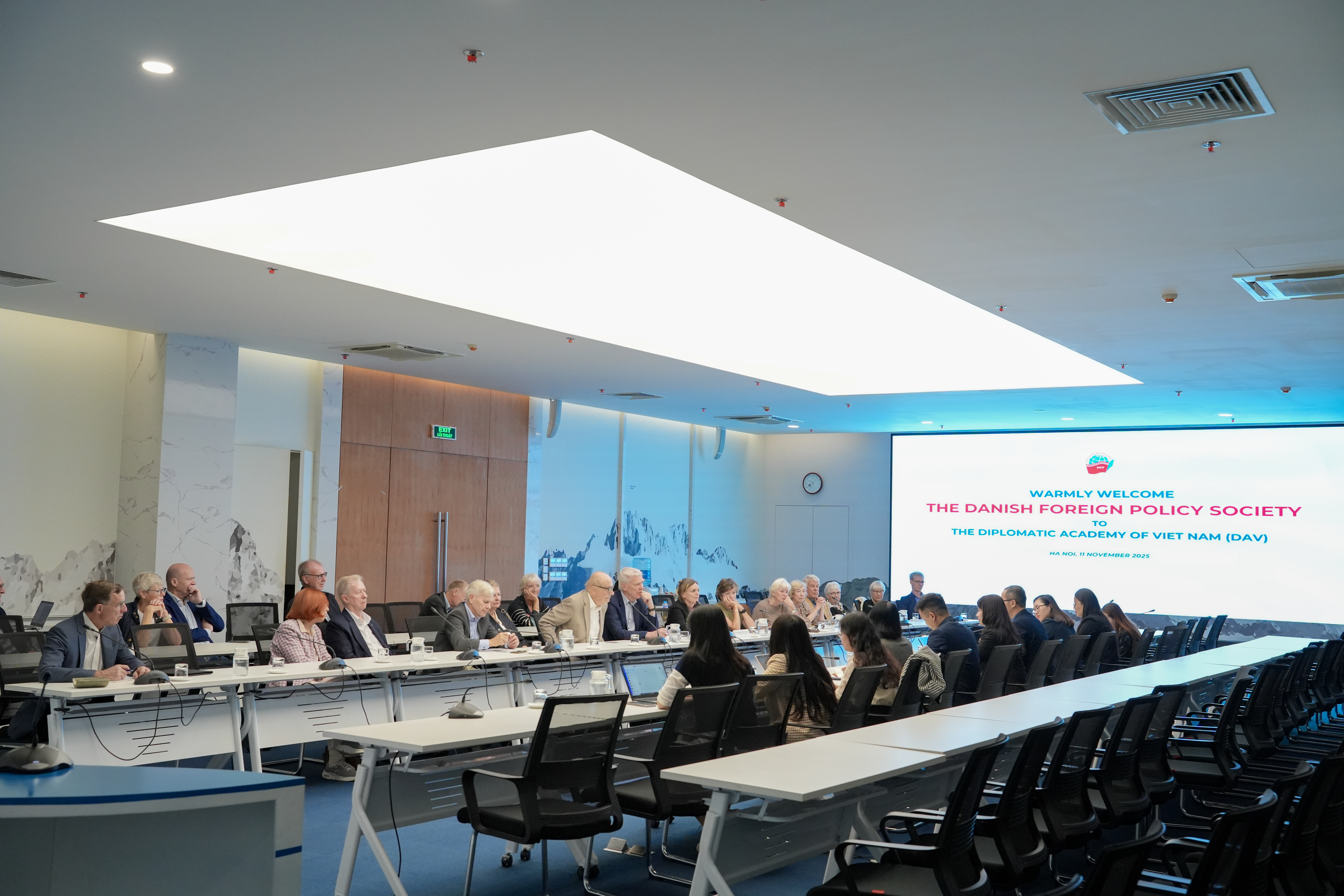PGS.TS. Nguyễn Thị Lan Anh hoan nghênh đoàn đến thăm và làm việc tại Học viện Ngoại giao; nhấn mạnh dù Việt Nam và Đan Mạch cách xa về địa lý, hai bên vẫn chia sẻ nhiều điểm tương đồng như cam kết thúc đẩy phát triển xanh, chuyển đổi số, hợp tác trên cơ sở tôn trọng lẫn nhau và đề cao luật pháp quốc tế. Ngoài ra, các chuyên gia của HVNG cũng chia sẻ và cập nhật thông tin về đường lối, chủ trương, tình hình và thành tựu chính trị, kinh tế, xã hội, đối ngoại của Việt Nam, qua đó mở ra nhiều định hướng và cơ hội hợp tác mới giữa hai nước trong thời gian tới.