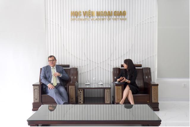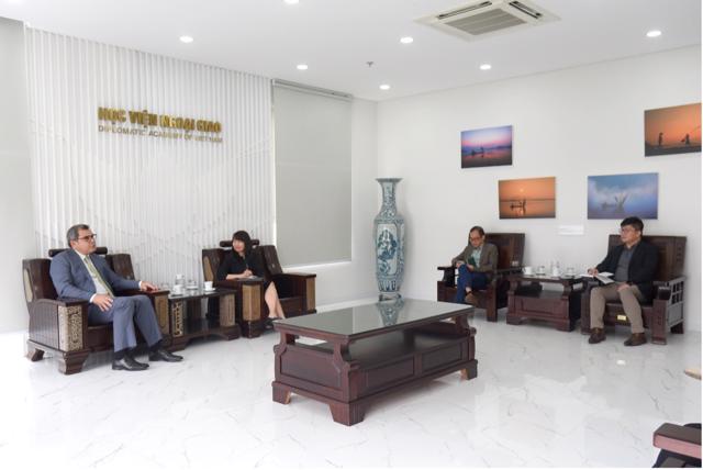 Chào mừng Đại sứ Antonios Papakostas đến thăm Học viện, PGS.TS. Nguyễn Thị Lan Anh đã giới thiệu khái quát về chức năng, nhiệm vụ, cơ cấu tổ chức và những thành tựu nổi bật của Học viện trong hơn 65 năm qua. Phó Giám đốc bày tỏ mong muốn tăng cường hợp tác giữa Học viện với các đối tác Hy Lạp trong khuôn khổ Biên bản ghi nhớ hợp tác (MoU) ký ngày 01/8/2022 giữa Bộ Ngoại giao hai nước về hợp tác đào tạo cán bộ ngoại giao. Theo đó, hai bên có thể triển khai các hoạt động như: chia sẻ thông tin về các khóa đào tạo; trao đổi giảng viên, chuyên gia và nhà nghiên cứu trong các lĩnh vực cùng quan tâm. PGS.TS. Nguyễn Thị Lan Anh đánh giá cao các đề xuất từ phía Đại sứ quán, đồng thời khẳng định Học viện sẵn sàng phối hợp chặt chẽ và tích cực để hiện thực hóa các ý tưởng đã trao đổi.