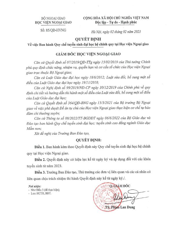 Thông tin Tuyển sinhĐại học QUY CHẾ TUYỂN SINH ĐẠI HỌC HỆ CHÍNH QUY 10:00 02/02/2023 Học viện Ngoại giao ban hành Quy chế tuyển sinh đại học hệ chính quy.Xem chi tiết tại đây. Tweet