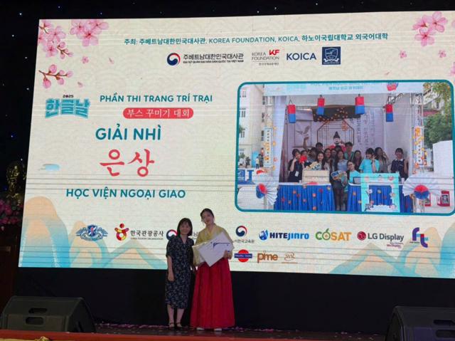Cụ thể, đoàn sinh viên Học viện Ngoại giao đã xuất sắc giành giải Nhì ở hạng mục Trang trí trại và giải Khuyến khích ở hạng mục Văn nghệ, qua đó khẳng định sự năng động, sáng tạo cũng như niềm đam mê đối với Tiếng Hàn và văn hóa Hàn Quốc của sinh viên Học viện Ngoại giao.