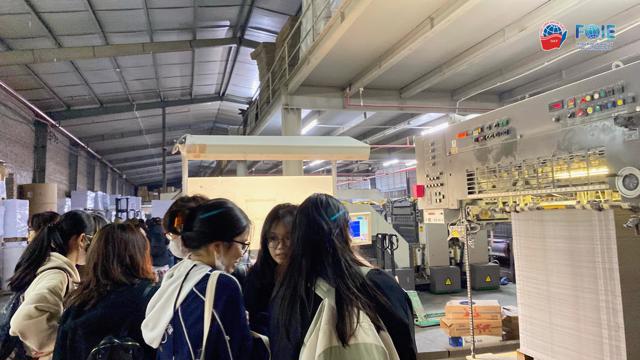 Sau khi tham quan Tân Hoàng Long, điểm đến thứ 2 là Công ty in bao bì Hà Tây. Công ty thành lập từ năm 2007 và chuyên sản xuất các loại bao bì đa dạng, bao gồm bao bì carton, bao bì giấy, bao bì nhựa và bao bì màng. Các sản phẩm của công ty được sử dụng rộng rãi trong các ngành công nghiệp như thực phẩm, dược phẩm, điện tử và các ngành khác. Các bạn sinh viên đã có cơ hội đi tham quan nhà xưởng, quan sát quy trình sản xuất của nhiều mẫu mã bao bì khác nhau. Dưới sự giới thiệu, chia sẻ nhiệt tình của Ban Quản lý, các bạn sinh viên đã học hỏi thêm kiến thức về các loại máy móc được sử dụng trong nhà xưởng.