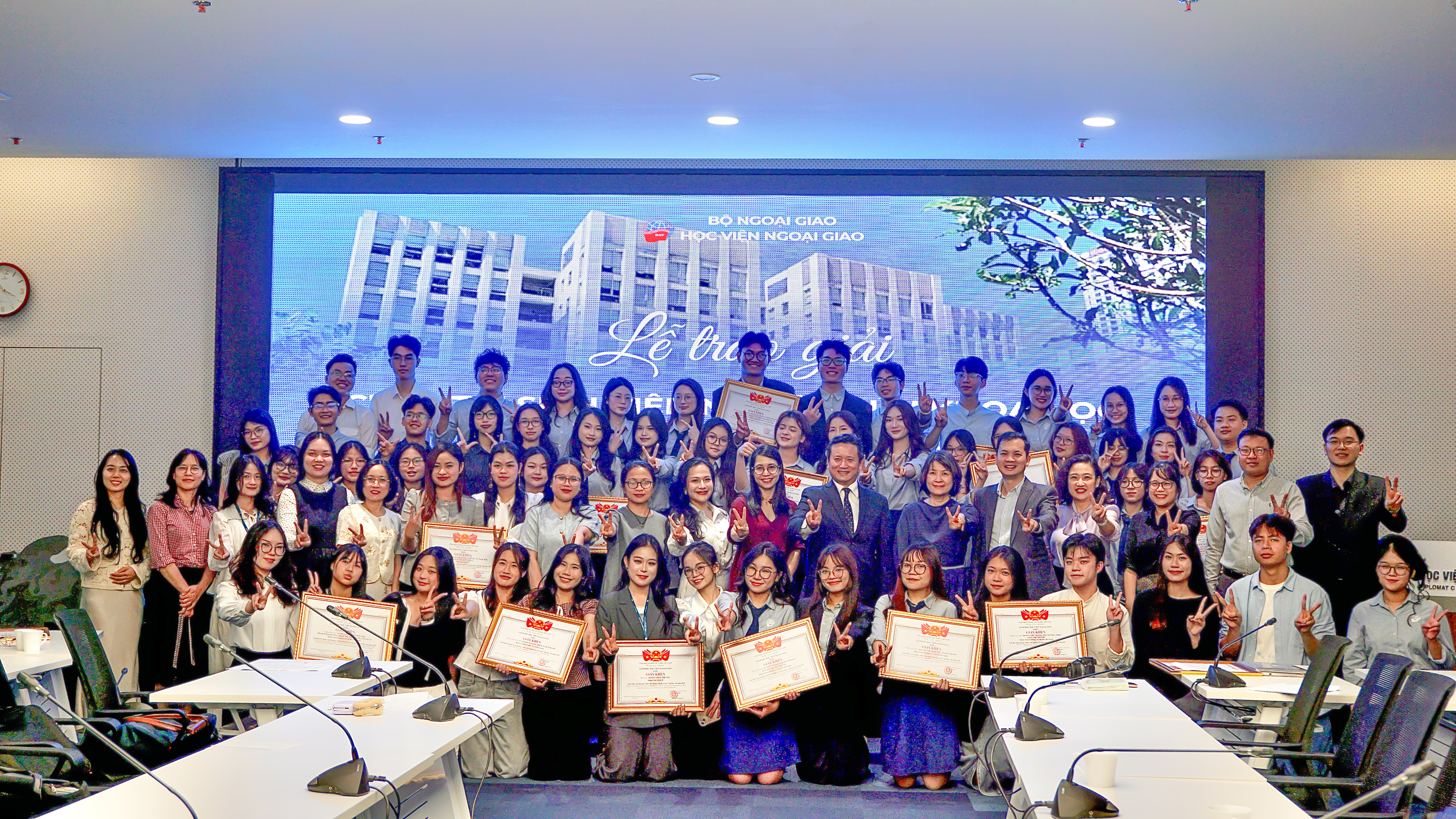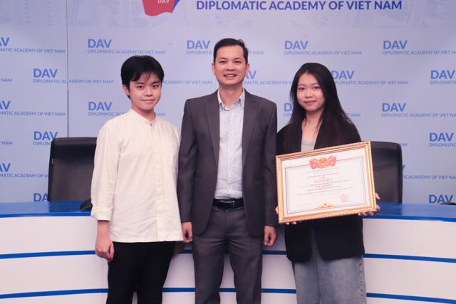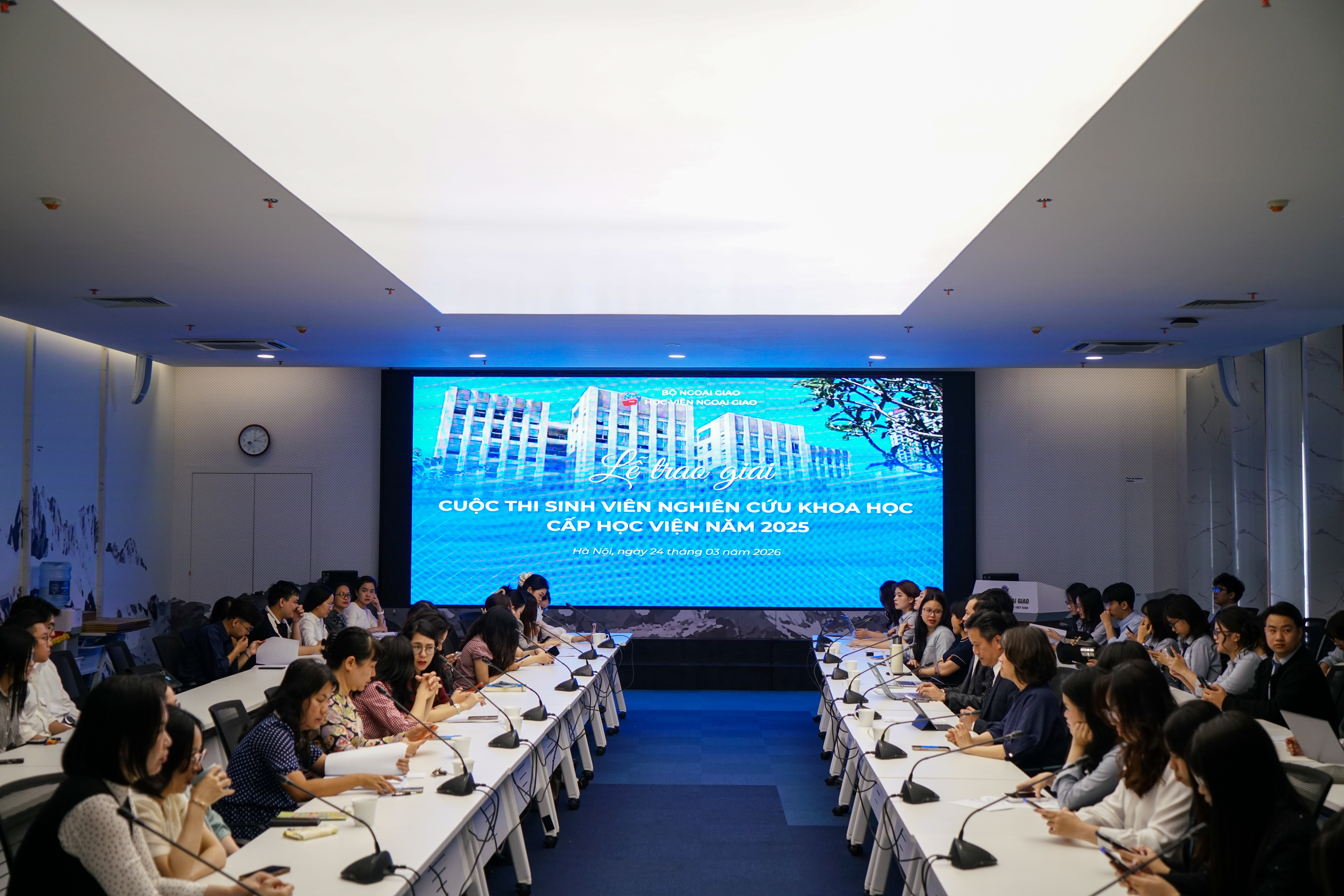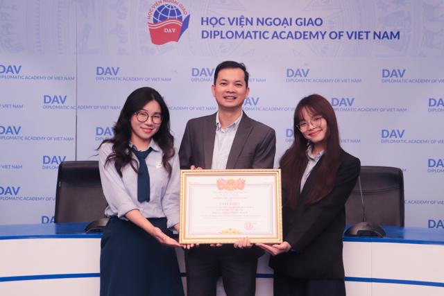 Vào chiều ngày 24/03/2026, Học viện Ngoại giao đã tổ chức Lễ trao giải Sinh viên Nghiên cứu khoa học cấp Học viện năm 2025 tại phòng Geneva. Chương trình tiếp tục khẳng định định hướng của Học viện trong việc thúc đẩy tinh thần nghiên cứu học thuật, khuyến khích sinh viên theo đuổi các dự án độc lập và góp phần xây dựng môi trường học thuật chuyên sâu, sáng tạo.