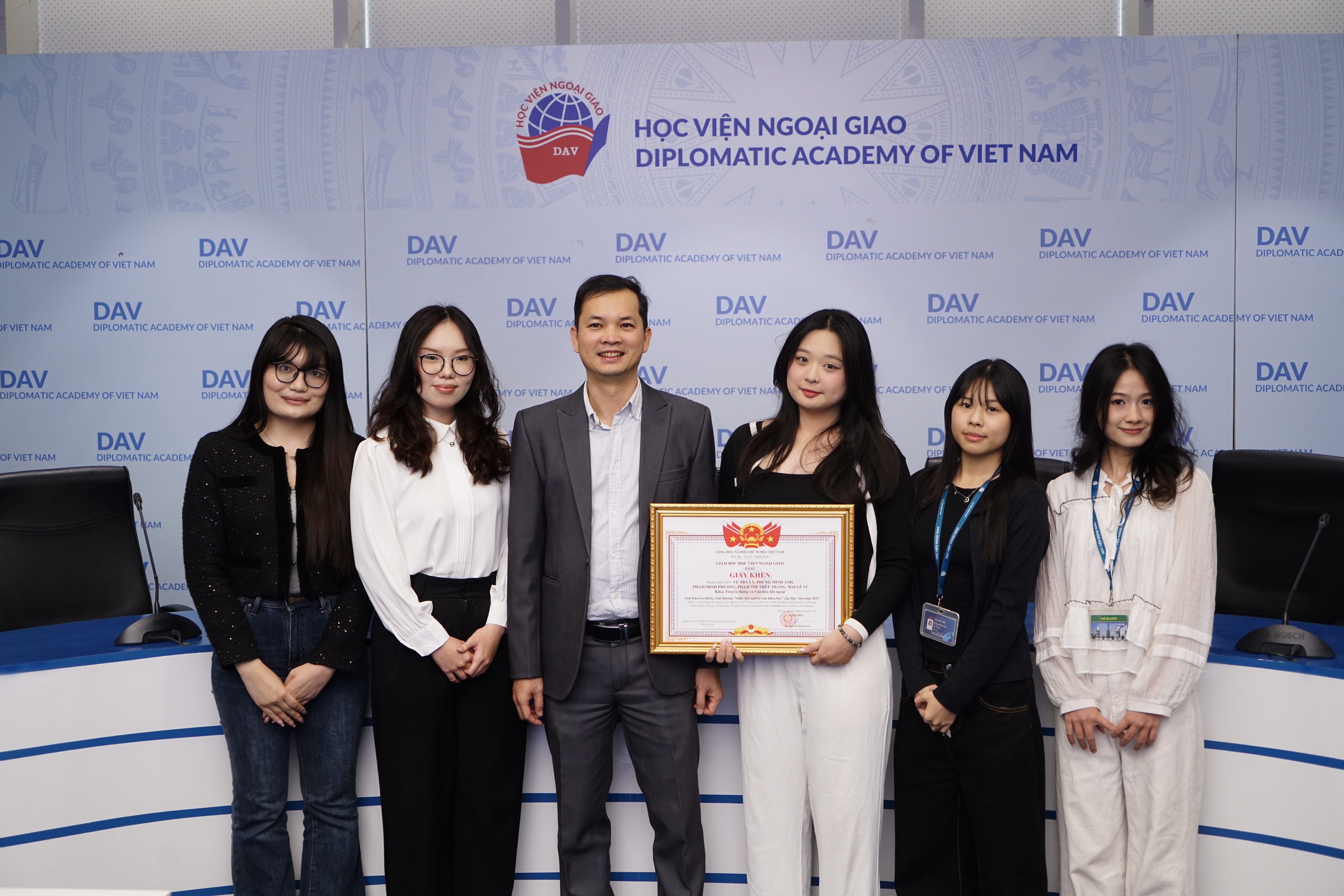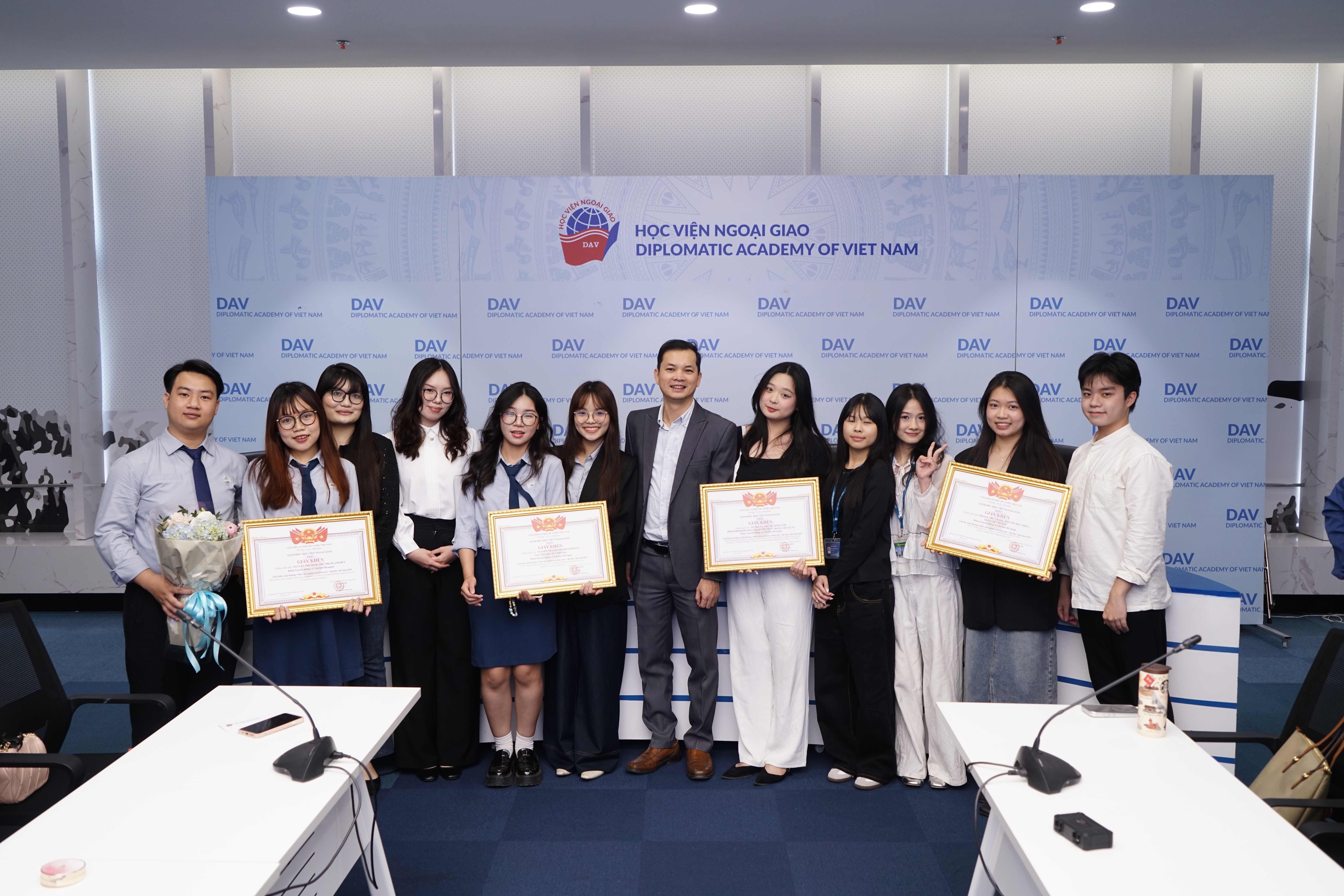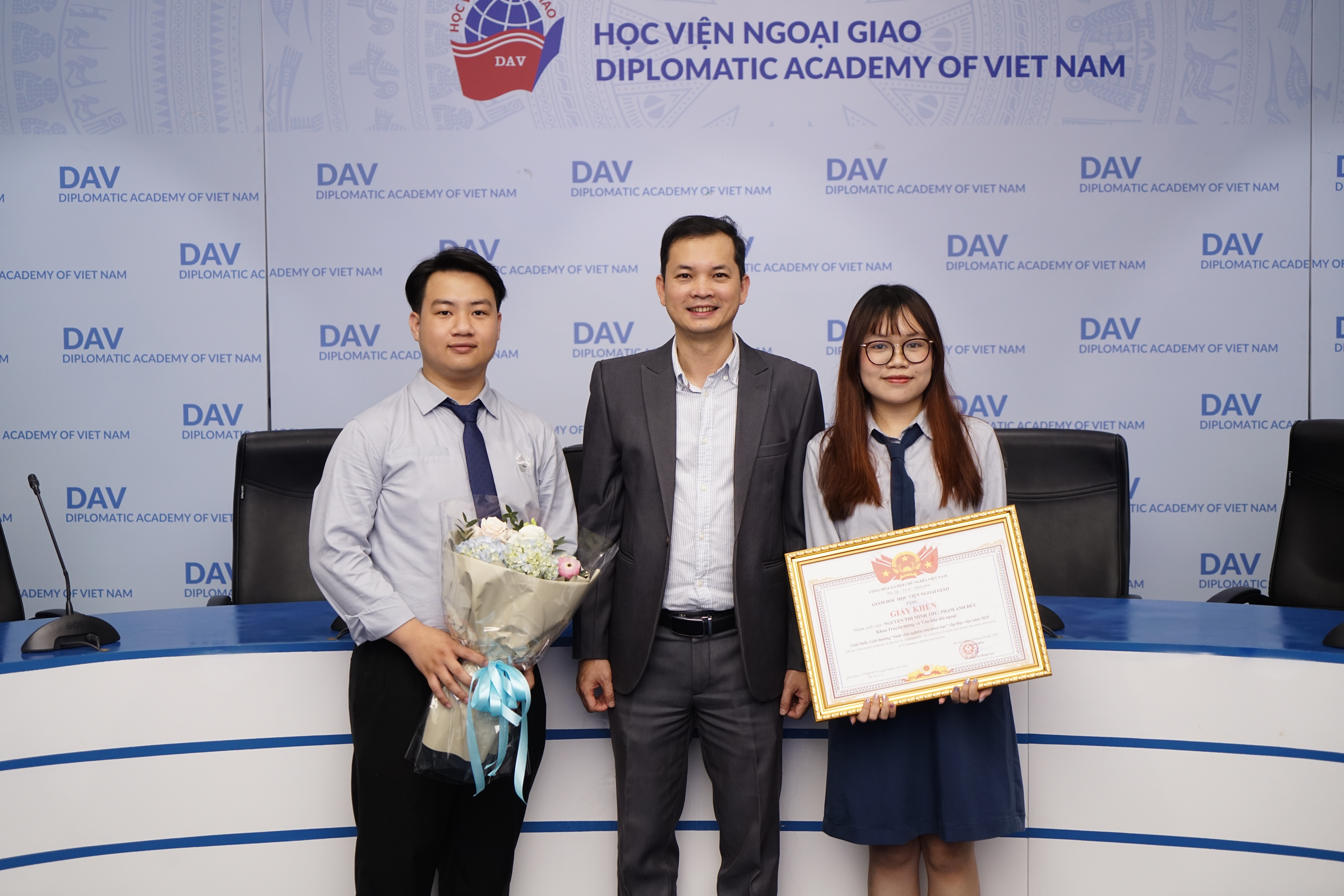 Vào chiều ngày 24/03/2026, Học viện Ngoại giao đã tổ chức Lễ trao giải Sinh viên Nghiên cứu khoa học cấp Học viện năm 2025 tại phòng Geneva. Chương trình tiếp tục khẳng định định hướng của Học viện trong việc thúc đẩy tinh thần nghiên cứu học thuật, khuyến khích sinh viên theo đuổi các dự án độc lập và góp phần xây dựng môi trường học thuật chuyên sâu, sáng tạo.