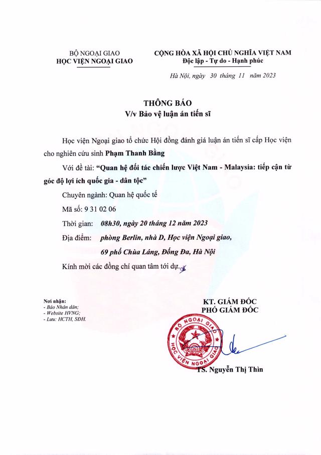 Đào tạoTiến sĩ Thông báo bảo vệ luận án tiến sĩ - Phạm Thanh Bằng 00:00 30/11/2023 Học viện Ngoại giao tổ chức Hội đồng đánh giá luận án tiến sĩ cấp Học viện cho nghiên cứu sinh Phạm Thanh Bằng Tweet