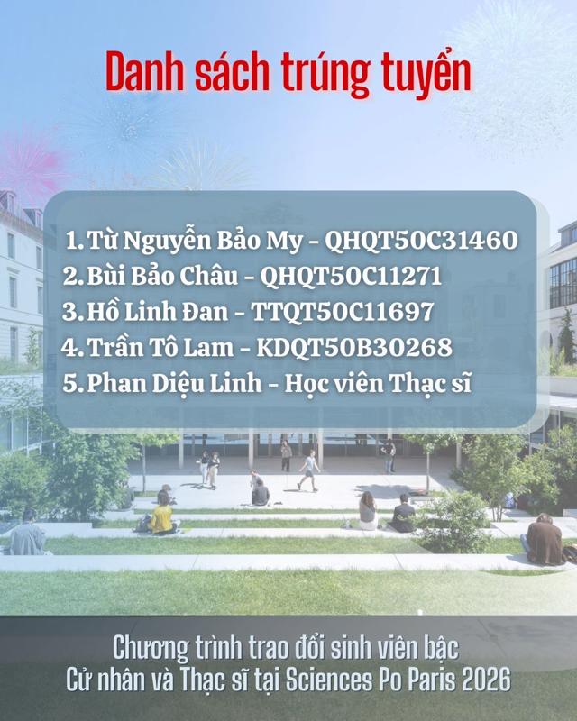 Học viện Ngoại giao trân trọng thông báo và chúc mừng các sinh viên - học viên đã trúng tuyển chương trình trao đổi tại đại học Sciences Po Paris 2026. Đây là dấu mốc quan trọng, ghi nhận những nỗ lực bền bỉ, tinh thần học thuật nghiêm túc và sự chuẩn bị kỹ lưỡng của các ứng viên trong suốt quá trình tuyển chọn.