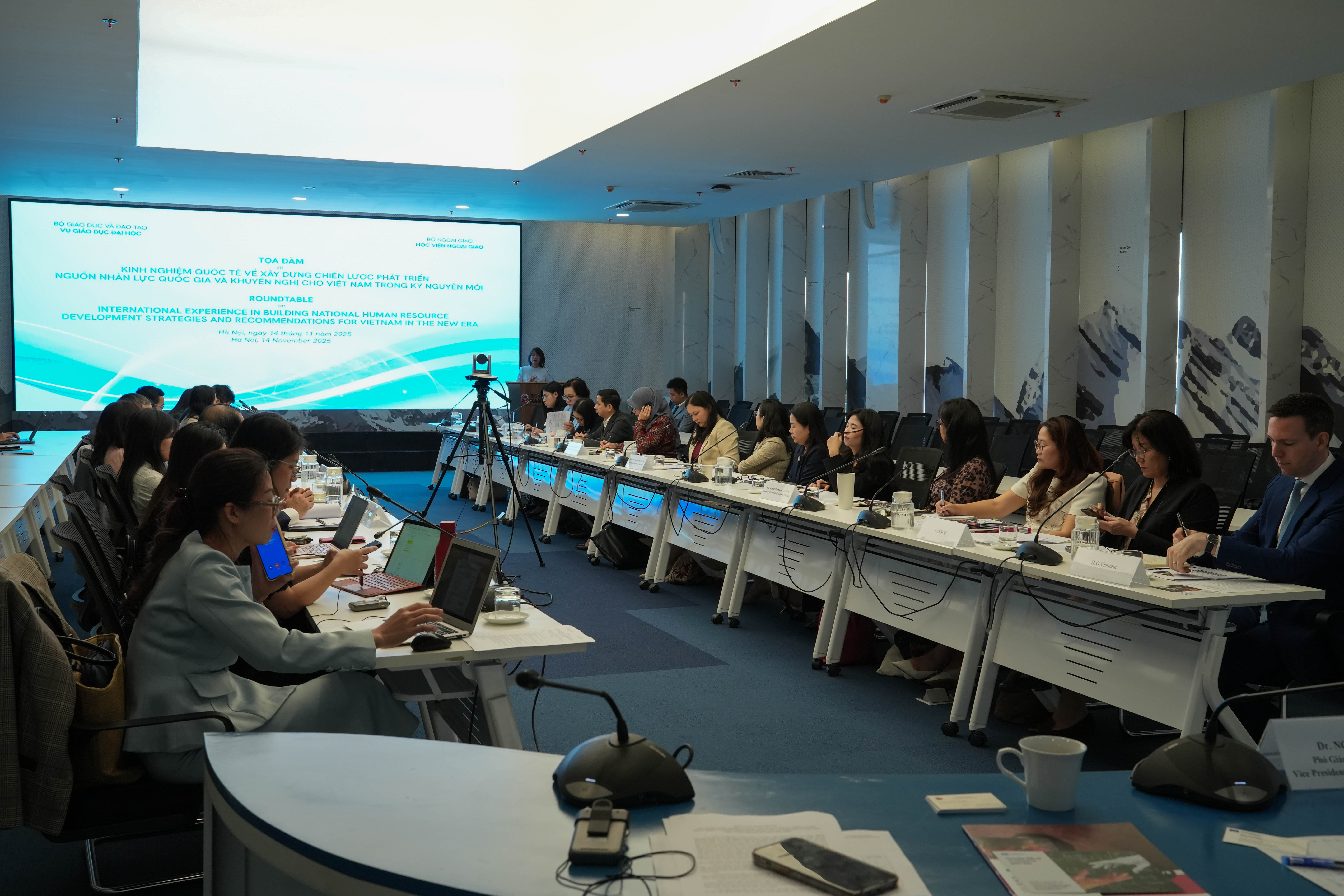 Sáng ngày 14/11/2025, Học viện Ngoại giao phối hợp với Vụ Giáo dục Đại học (Bộ Giáo dục và Đào tạo) tổ chức Tọa đàm “Kinh nghiệm quốc tế về xây dựng Chiến lược phát triển nguồn quốc gia và khuyến nghị cho Việt Nam trong kỷ nguyên mới”. Tọa đàm mang ý nghĩa quan trọng đối với quá trình xây dựng Chiến lược phát triển nguồn nhân lực của Việt Nam cho giai đoạn 2026 - 2030 và tầm nhìn đến năm 2050.