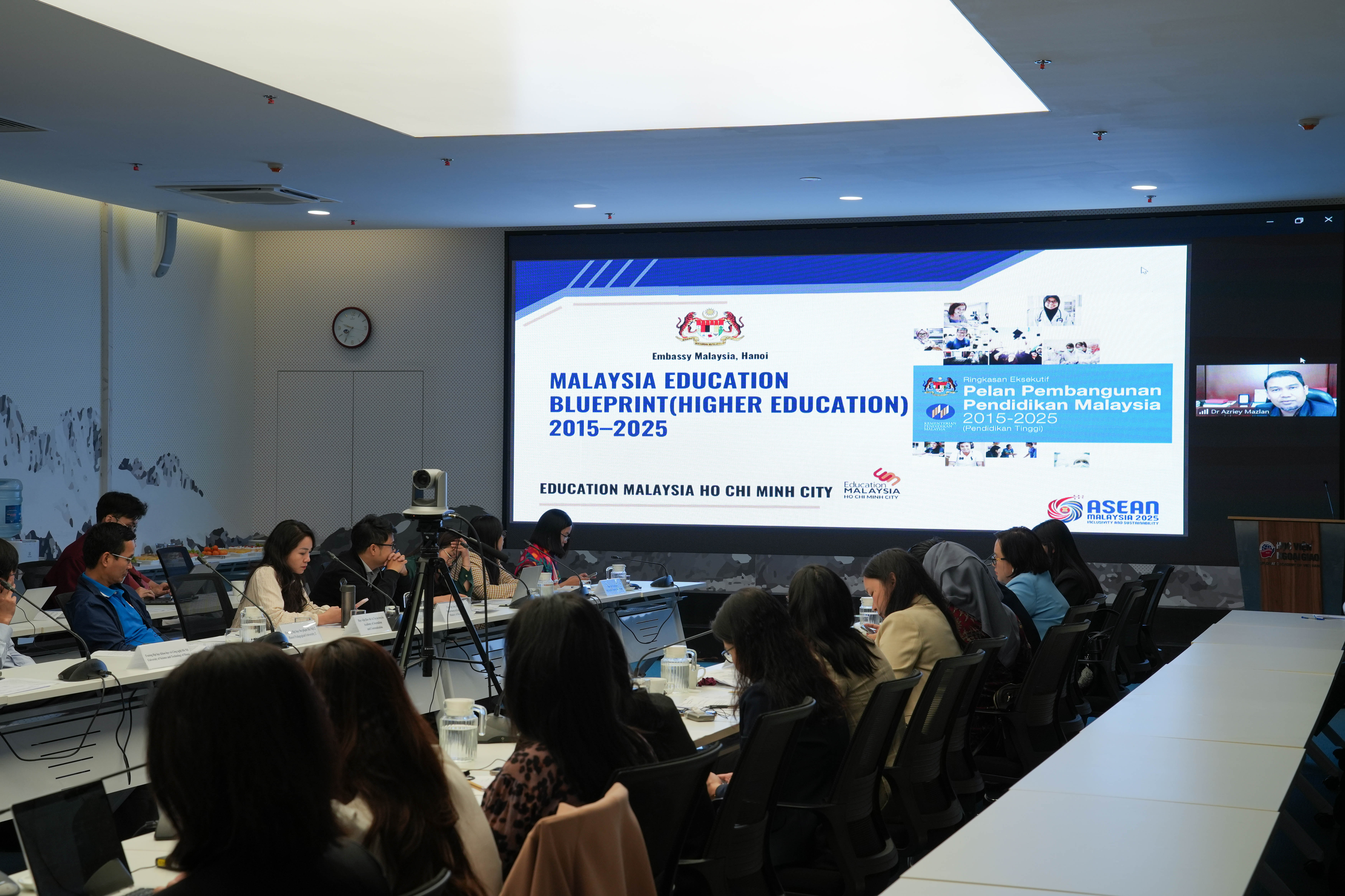 Tập trung vào phần phát triển giáo dục đại học, TS. Azriey Mazlan chia sẻ kinh nghiệm xây dựng chiến lược phát triển giáo dục đại học của Malaysia giai đoạn 2015 – 2025. Malaysia đặc biệt chú trọng vào hợp tác quốc tế không chỉ nhằm thu hút sinh viên quốc tế, đặc biệt từ các nước ASEAN, mà còn giúp sinh viên Malaysia tiếp cận kiến thức chất lượng cao mà không cần du học. Hiện nay, các trường đại học tại Malaysia hợp tác với hơn 100 cơ sở giáo dục, đối tác quốc tế, mang đến trải nghiệm học tập, kết nối mạng lưới sinh viên đa quốc gia và cơ hội thực tập đa dạng, nổi bật nhất trong lĩnh vực công nghệ tiên tiến. Chiến lược này của Malaysia được TS. Đặng Văn Huấn đánh giá cao và phù hợp để Việt Nam có thể học hỏi, đặc biệt trong việc xây dựng hệ sinh thái giáo dục đại học chất lượng cao, thu hút sinh viên quốc tế và gắn kết đào tạo với nhu cầu thực tiễn, nhằm chuẩn bị nguồn nhân lực sẵn sàng cho tương lai.