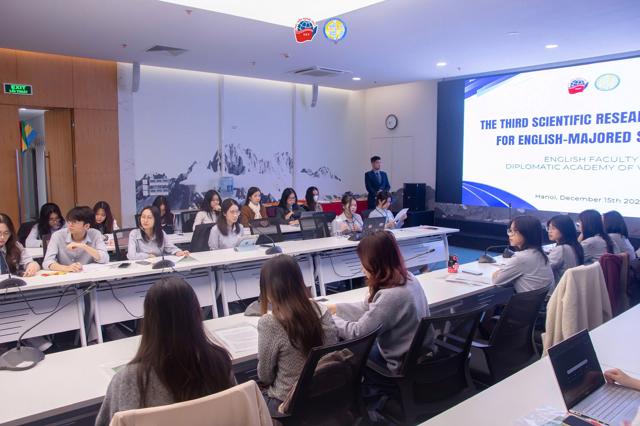 Vào sáng thứ Hai, ngày 15 tháng 12 năm 2025, Khoa Tiếng Anh – Học viện Ngoại giao đã tổ chức thành công Hội thảo Nghiên cứu khoa học sinh viên ngành Ngôn ngữ Anh lần thứ Ba tại Phòng Geneva. Chương trình tiếp tục sứ mệnh của Khoa trong việc thúc đẩy tinh thần nghiên cứu học thuật, khuyến khích sinh viên theo đuổi các dự án nghiên cứu độc lập và nuôi dưỡng môi trường học thuật chuyên sâu.