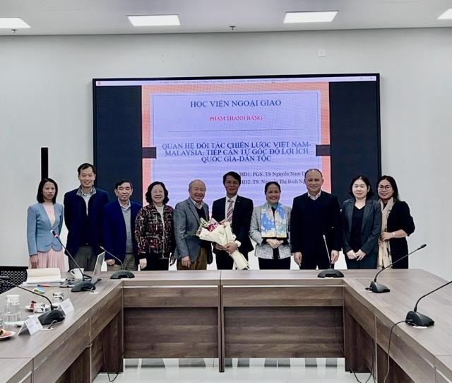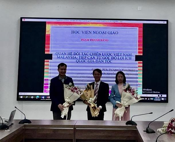 Ngày 20/12/2023, tại Học viện Ngoại giao nghiên cứu sinh (NCS) Phạm Thanh Bằng đã bảo vệ thành công luận án tiến sĩ cấp Học viện chuyên ngành Quan hệ quốc tế, mã số 9.31.02.06 với đề tài “Quan hệ đối tác chiến lược Việt Nam - Malaysia: tiếp cận từ góc độ lợi ích quốc gia - dân tộc”, dưới sự hướng dẫn khoa học của PGS.TS. Nguyễn Nam Dương và TS. Nguyễn Thị Bích Ngọc.