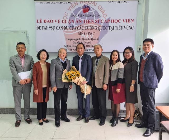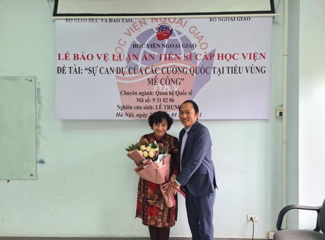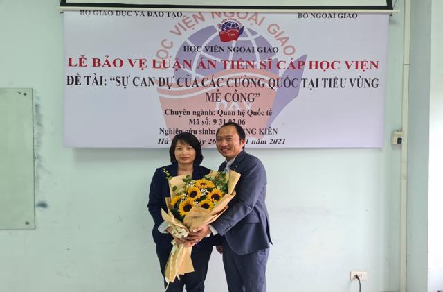 Ngày 26/01/2021, tại Học viện Ngoại giao nghiên cứu sinh (NCS) Lê Trung Kiên đã bảo vệ thành công luận án tiến sĩ cấp Học viện chuyên ngành Quan hệ quốc tế, mã số 9.31.02.06 với đề tài “Sự can dự của các cường quốc tại Tiểu vùng Mê Công”, dưới sự hướng dẫn khoa học của PGS.TS. Đặng Cẩm Tú và GS.TS. Nguyễn Thái Yên Hương.
