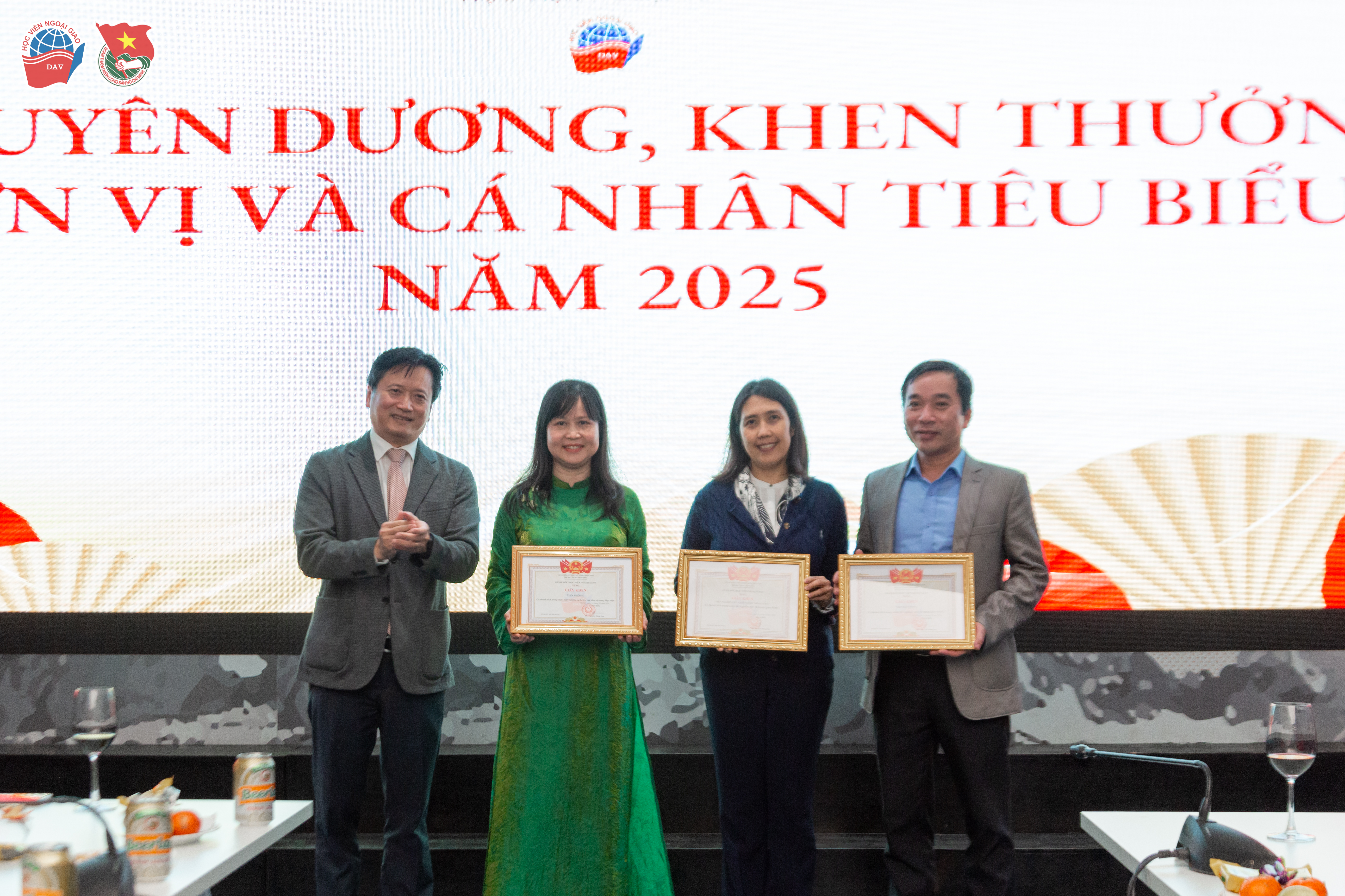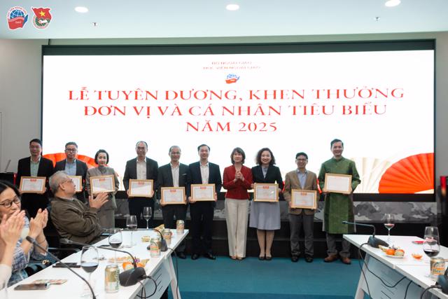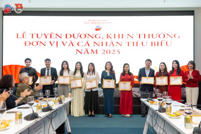Tiếp nối chương trình, Thứ trưởng trao tặng Học viện Ngoại giao danh hiệu “Đơn vị điển hình tiên tiến giai đoạn 2020 - 2025” theo Quyết định số 3991/QĐ-BNG ngày 10/11/2025 của Bộ Ngoại giao. Đây là sự ghi nhận đối với những nỗ lực và thành tích nổi bật của Học viện trong bối cảnh ngành ngoại giao không ngừng đổi mới, thích ứng với yêu cầu ngày càng cao của tình hình quốc tế và nhiệm vụ đối ngoại trong giai đoạn mới. Tiếp theo đó, lãnh đạo Học viện đã trao giấy khen thưởng cho tập thể và các cá nhân thuộc Viện Nghiên cứu Chiến lược Ngoại giao, Viện Biển Đông, Văn phòng Học viện, các Ban chức năng, Khoa chuyên môn và Khoa Ngoại ngữ. Qua đó, các hoạt động khen thưởng khẳng định sự ghi nhận, động viên kịp thời đối với nỗ lực của các tập thể, cá nhân; đồng thời, tạo động lực để toàn thể Học viện tiếp tục phấn đấu, nâng cao chất lượng công tác trong thời gian tới.