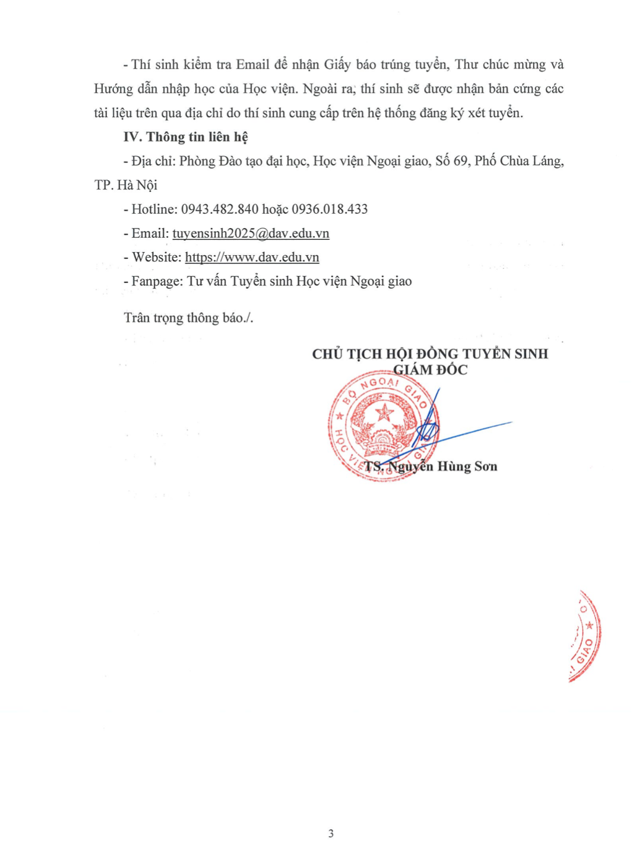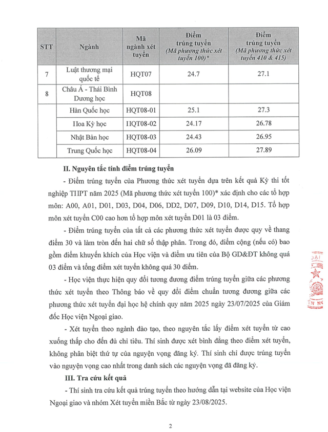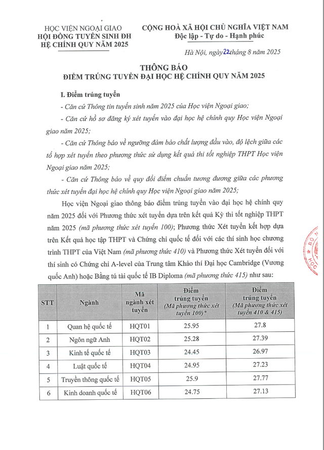 Tuyển sinh Điểm trúng tuyển Đại học hệ chính quy năm 2025 20:37 22/08/2025 Học viện Ngoại giao thông báo điểm trúng tuyển Đại học hệ chính quy năm 2025 * Thí sinh tra cứu kết quả tại đây: http://kqmb.hust.edu.vn/Xem Thông báo Điểm trúng tuyển Đại học hệ chính quy năm 2025 bản .PDF tại đây. Tweet