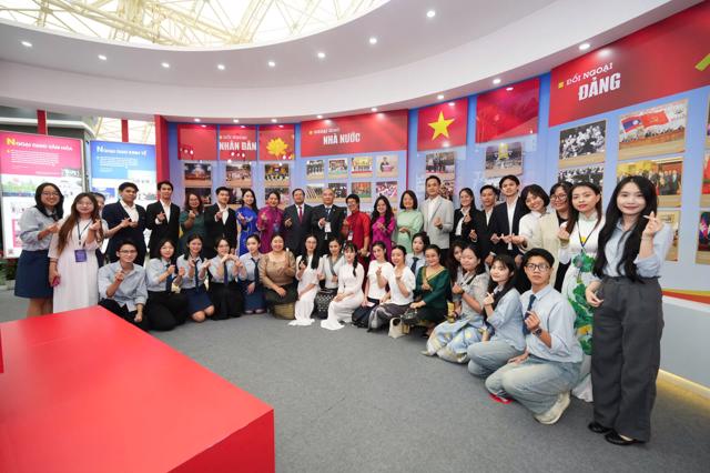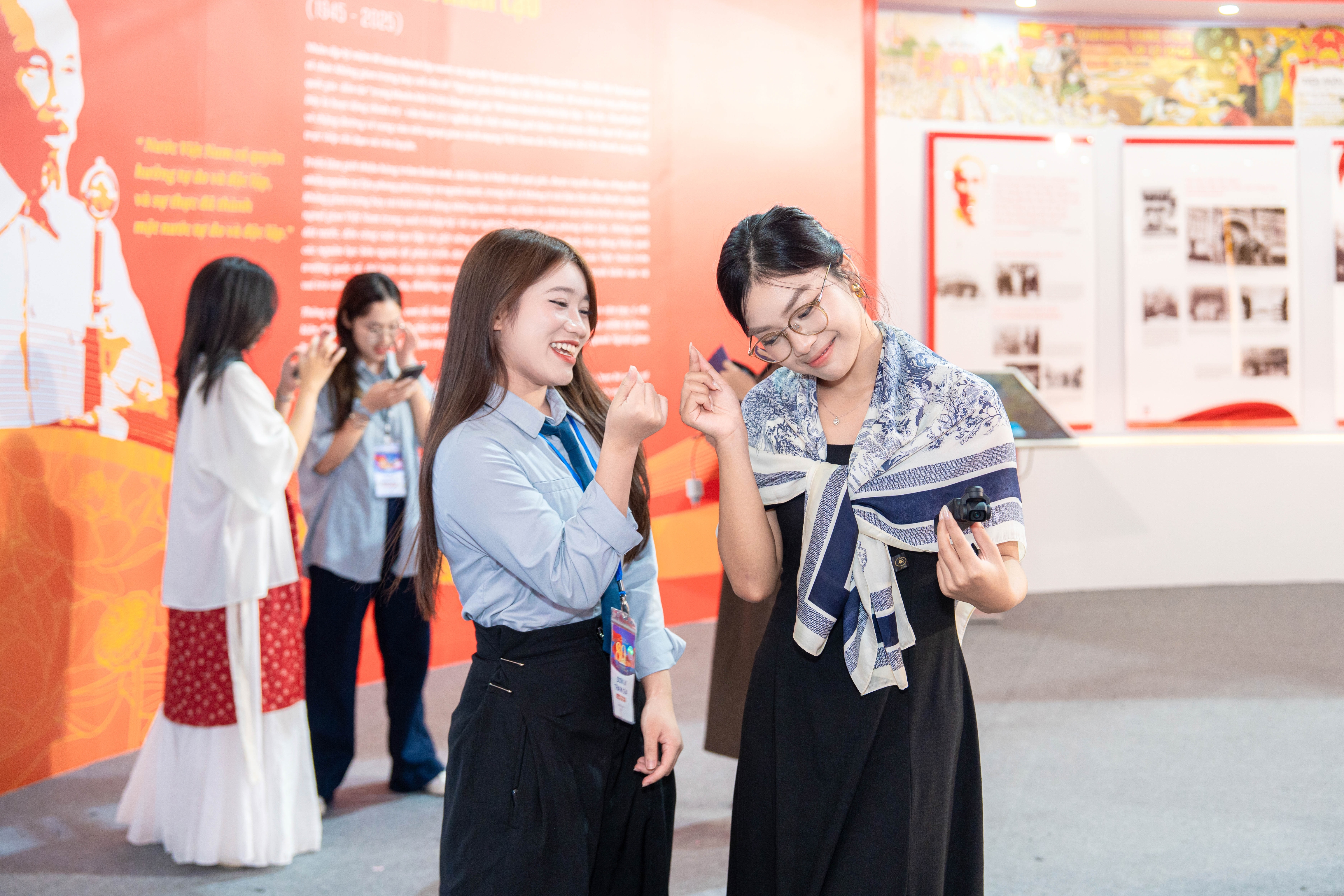 Ngay từ buổi trực đầu tiên, khi đặt chân vào khu triển lãm rực cờ đỏ, tim chúng tôi như đập nhanh hơn, đầy cảm giác tự hào xen lẫn với niềm háo hức. Mỗi gian trưng bày, mỗi hiện vật, mỗi thước phim tư liệu của 63 tỉnh thành và các Bộ, ngành như một lời nhắc về chặng đường đất nước đã đi qua - gian khổ nhưng kiêu hãnh. Chúng tôi cảm nhận rõ trọng trách: vừa là người giới thiệu thành tựu ngoại giao của Việt Nam, vừa là cầu nối đưa lịch sử sống động đến với công chúng.