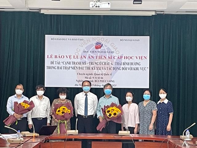 Ngày 15/06/2021, tại Học viện Ngoại giao nghiên cứu sinh (NCS) Bùi Phúc Long đã bảo vệ thành công luận án tiến sĩ cấp Học viện chuyên ngành Quan hệ quốc tế, mã số 9.31.02.06 với đề tài “Cạnh tranh Mỹ - Trung ở Châu Á – Thái Bình Dương trong hai thập niên đầu thế kỷ XXI và tác động đối với khu vực”, dưới sự hướng dẫn khoa học của TS. Lê Hải Bình và GS.TS. Nguyễn Thái Yên Hương.